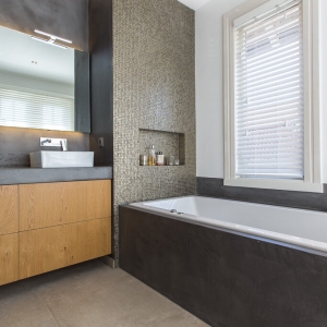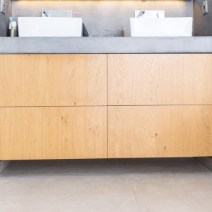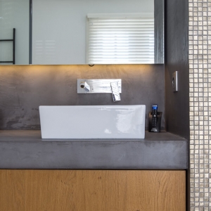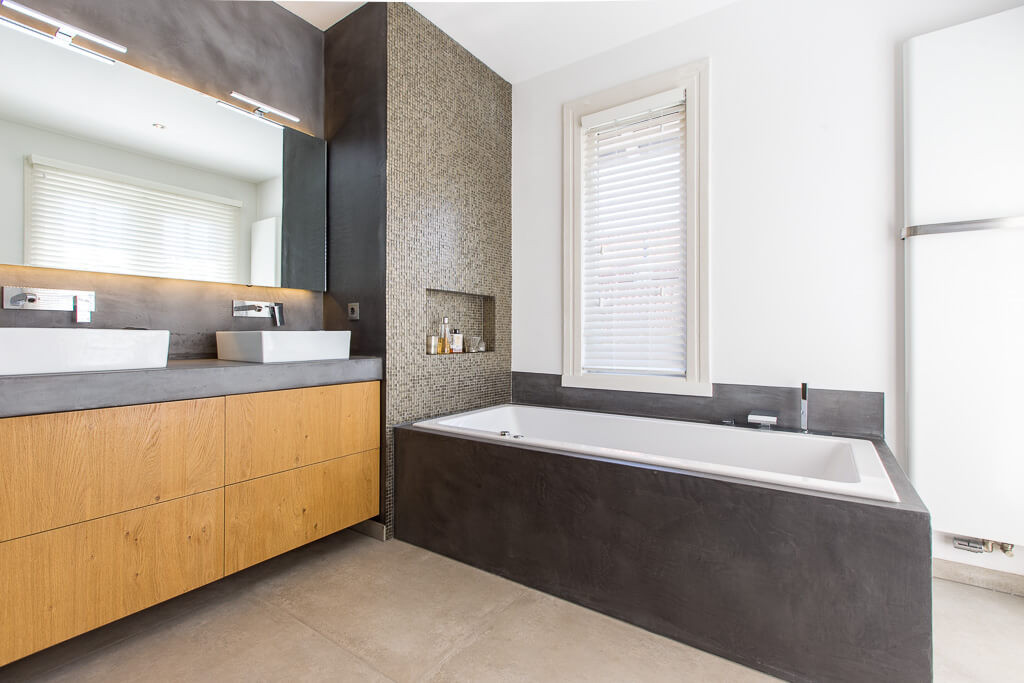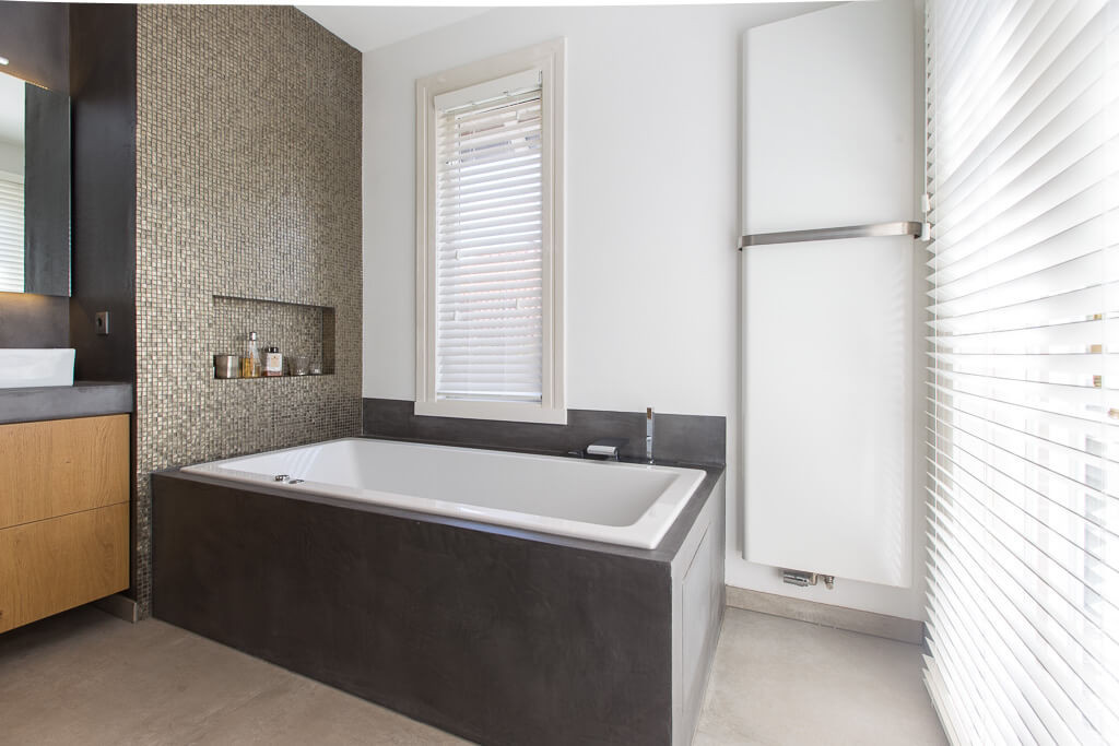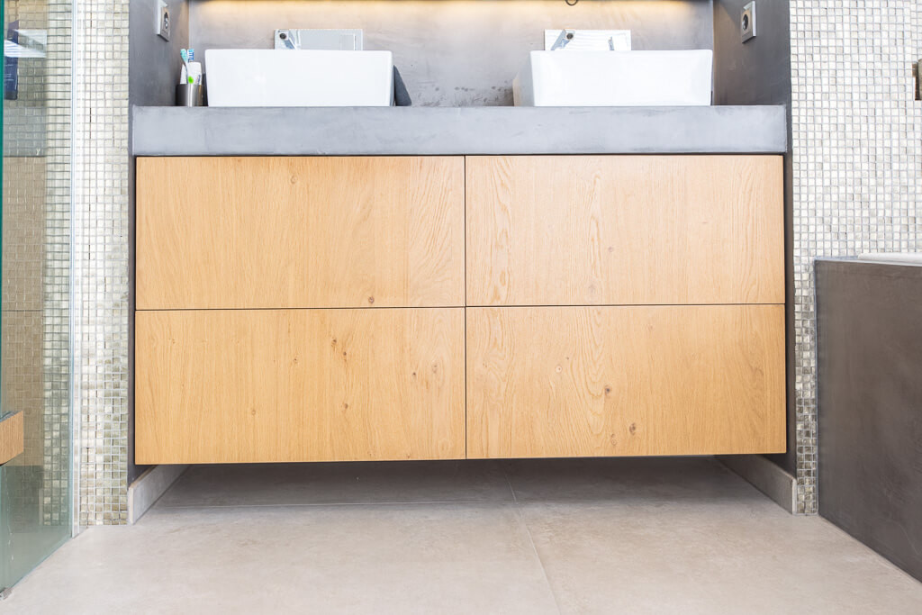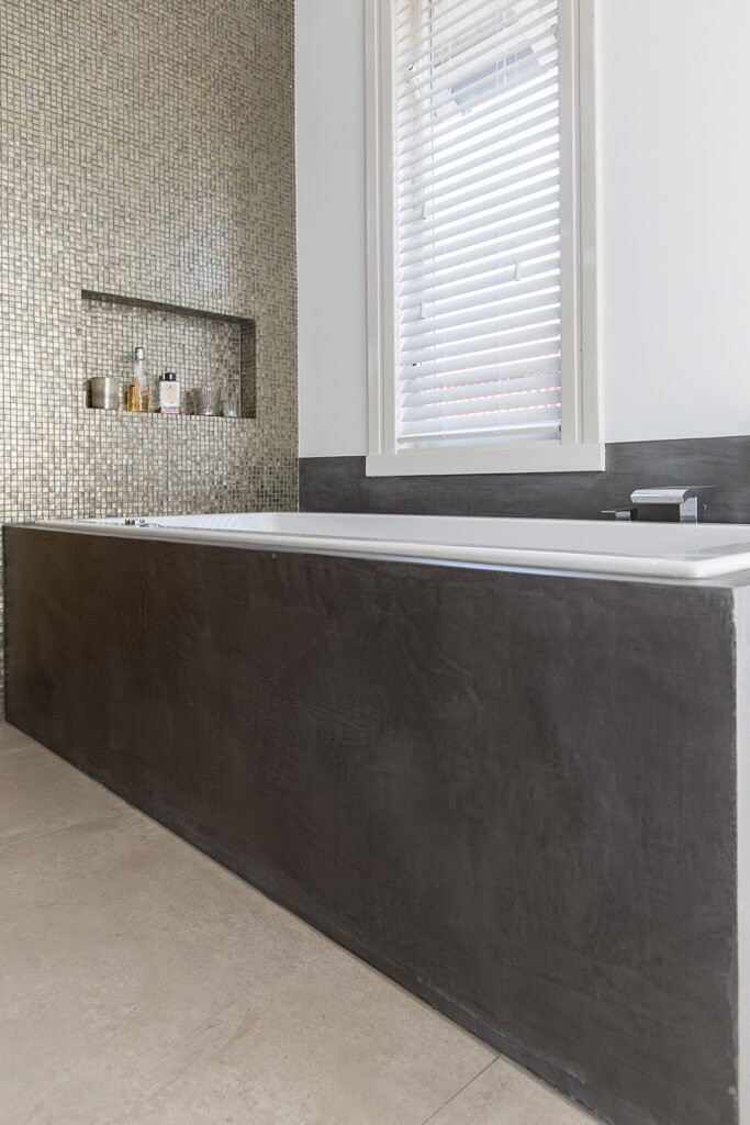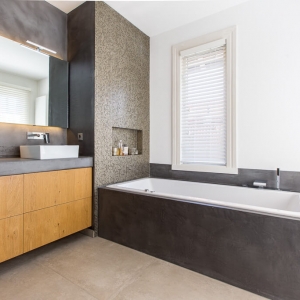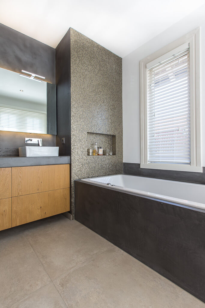 Moderne betonlook keramiek & glasmozaïek tegels in De Bilt