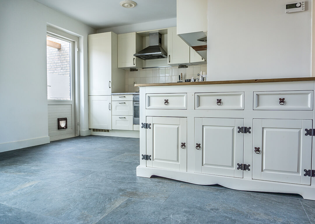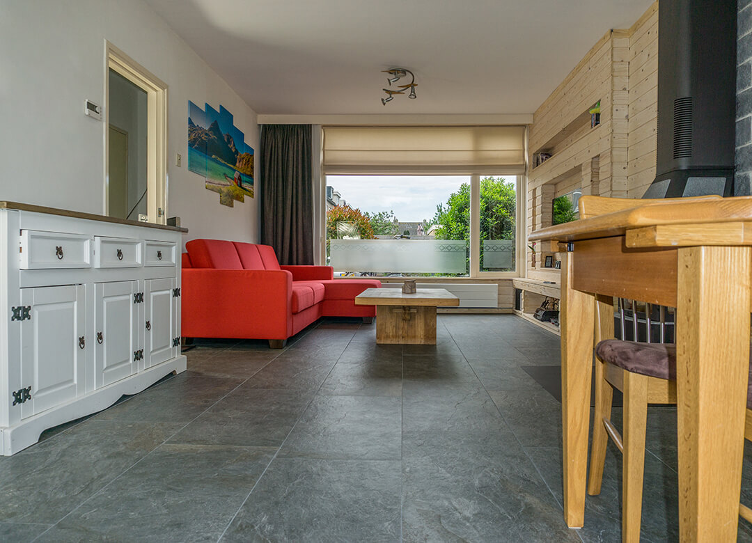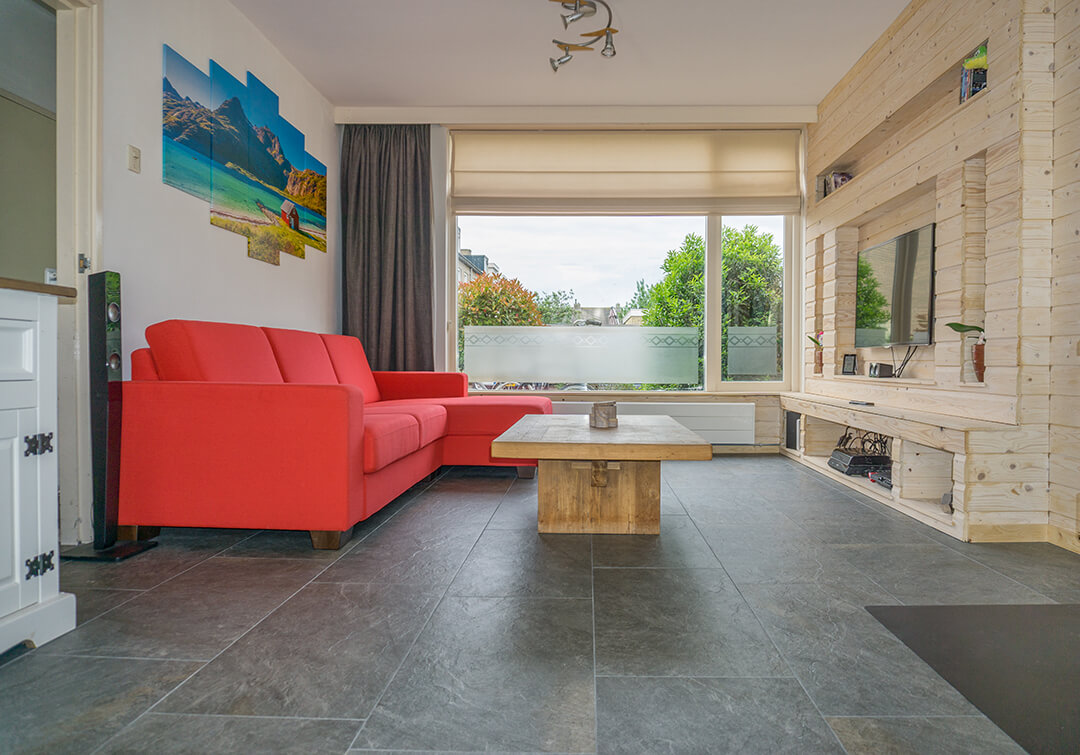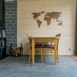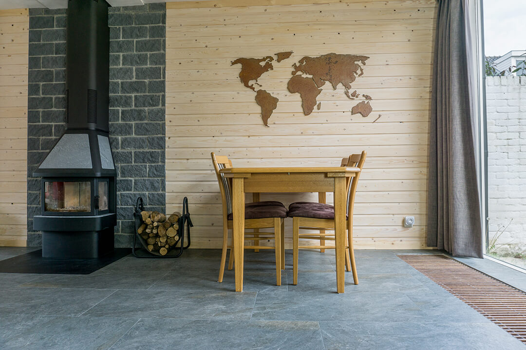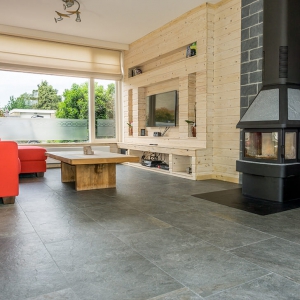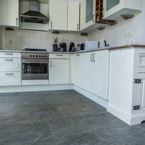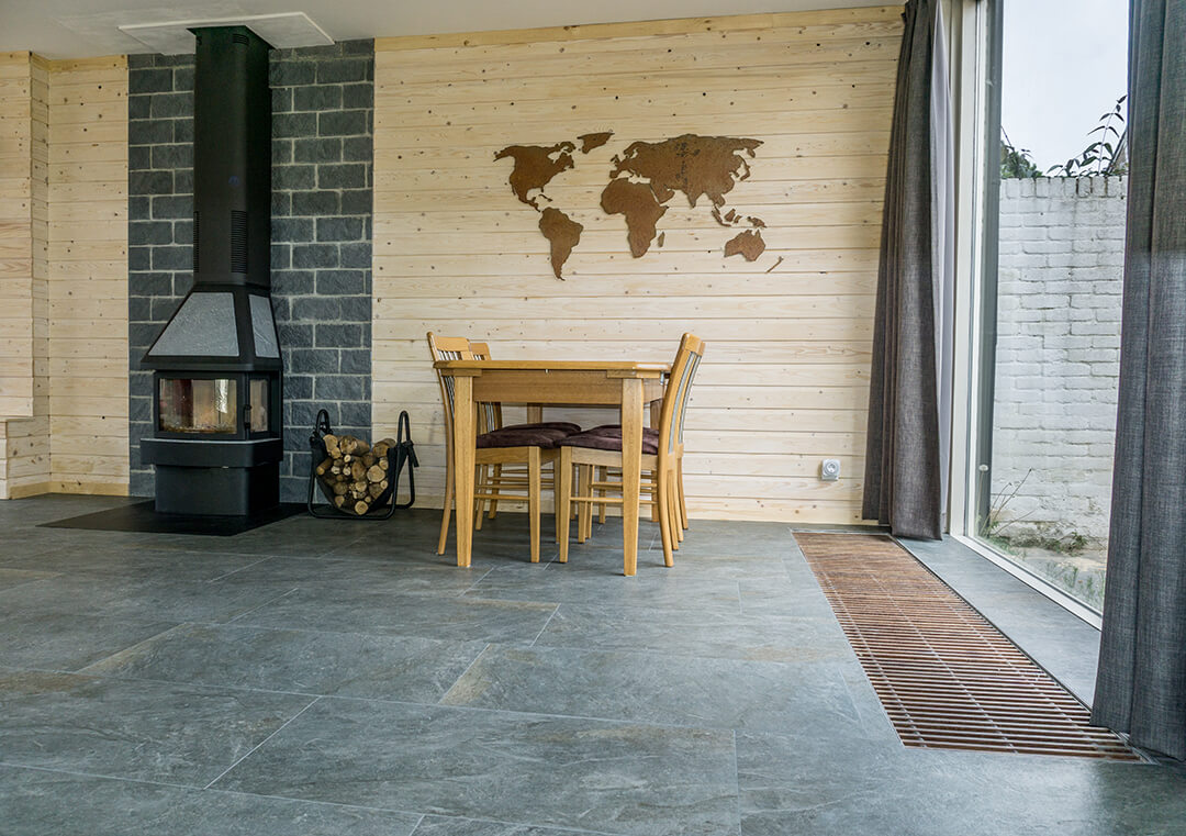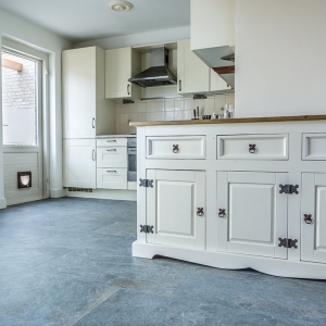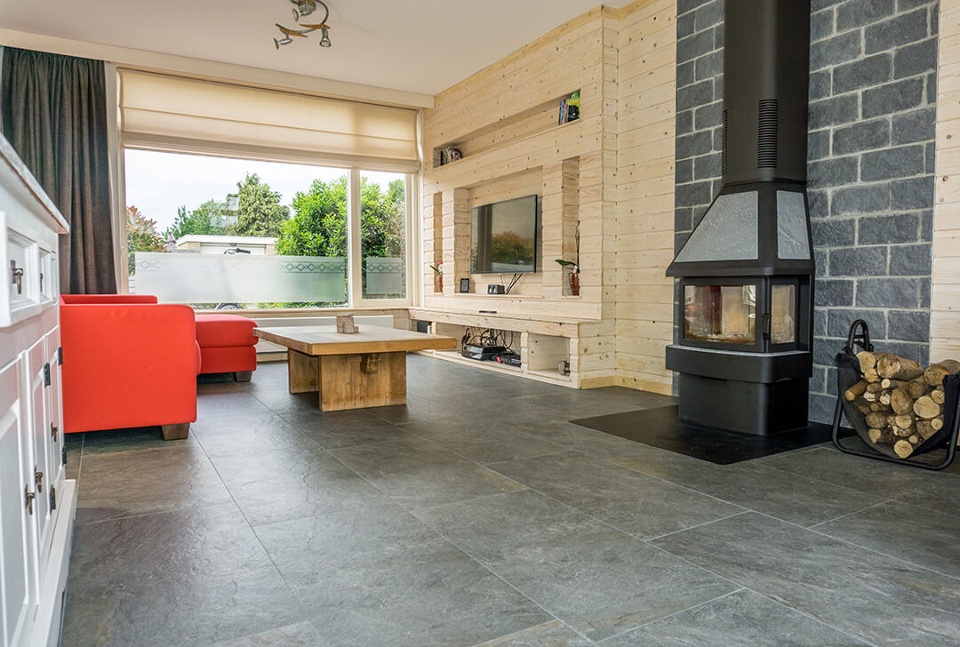 De familie van Walraven was op zoek naar een mooie tegel die goed past in een ruimte met veel houten elementen. De groene en grijze kleurtinten van de Leisteen Look Grey Keramiek vloer passen hier perfect bij.