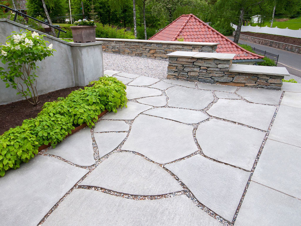 Deze Flagstones dienen verwerkt te worden in de specie. Op deze manier komen de breukstukken namelijk goed stabiel te liggen en kunnen ze netjes afgevoegd worden met zand en cement.