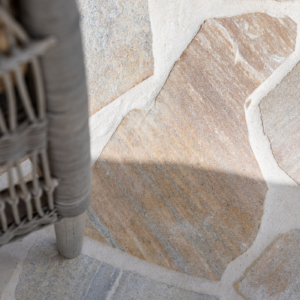 De Flagstones Brasil Yellow kunnen het beste verwerkt worden in de specie. Op deze manier liggen de stenen goed vast en kunnen ze ook goed gevoegd worden.
