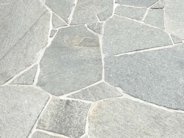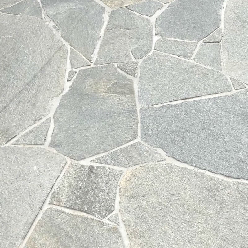De Natural Grey Flagstones bestaan uit breukruwe breukstenen die steeds variëren van formaat. Door de stenen zorgvuldig in elkaar te puzzelen ontstaat uiteindelijk een uniek oppervlak met een speels karakter. Dit materiaal is uitermate geschikt voor het Nederlandse klimaat. Want door het breukruwe oppervlak worden de tegels niet glad. Zelfs niet na een flinke regenbui.