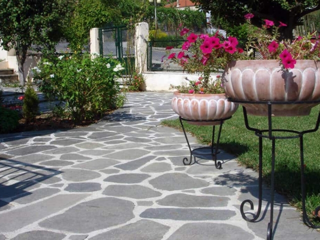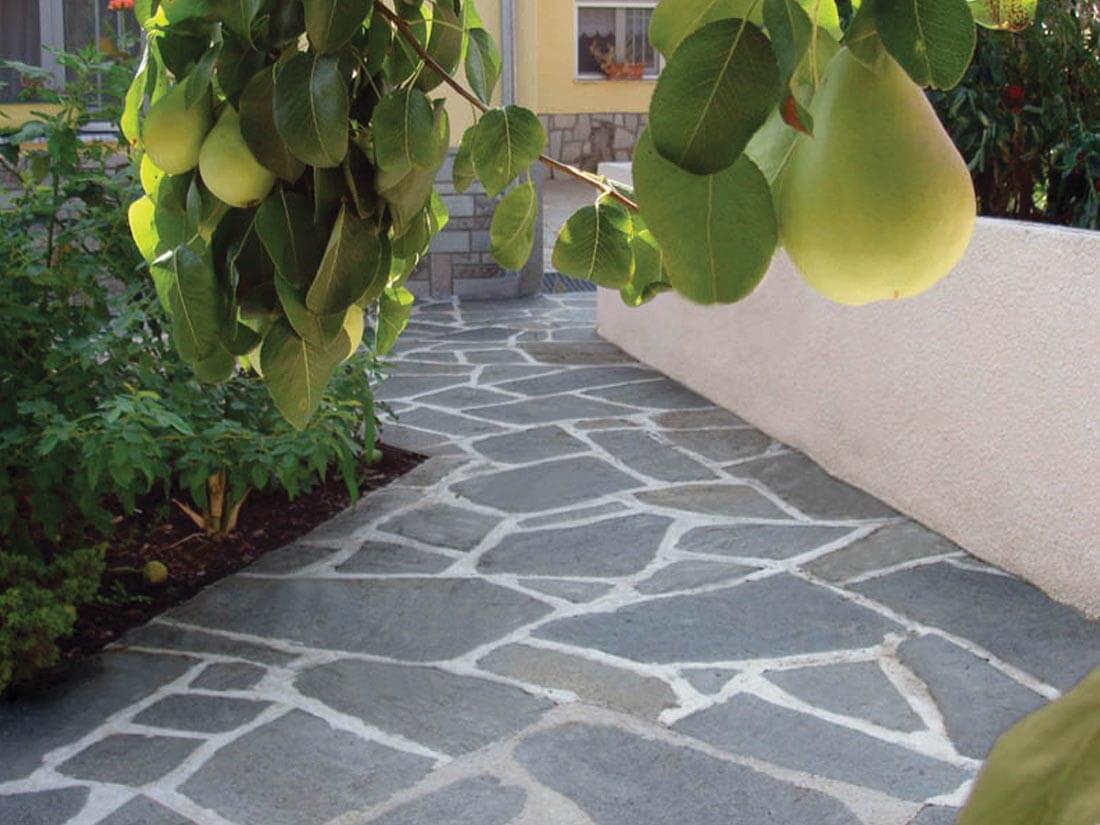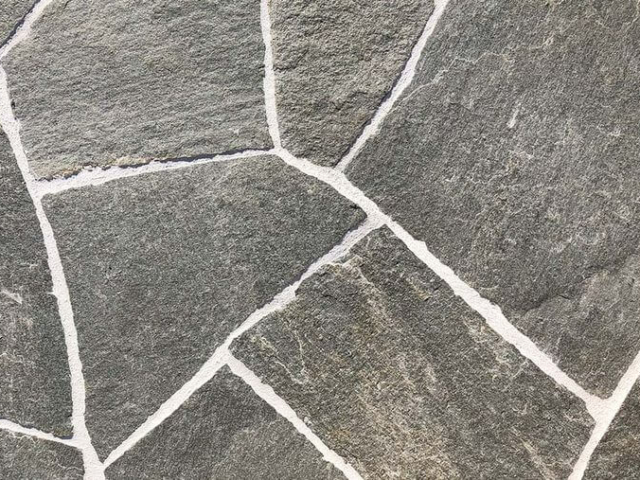 De Pierre de fermier flagstones zijn. 1 tot 3 cm dik. Hierdoor kunnen deze stenen het beste verwerkt worden in het gestabiliseerde terrasgranulaat. Hierin kunnen de dikte verschillen makkelijk opgevangen worden. Hierna kunnen de stenen gevoegd worden op cementbasis. Dit geeft het mooiste resultaat.