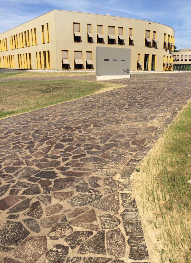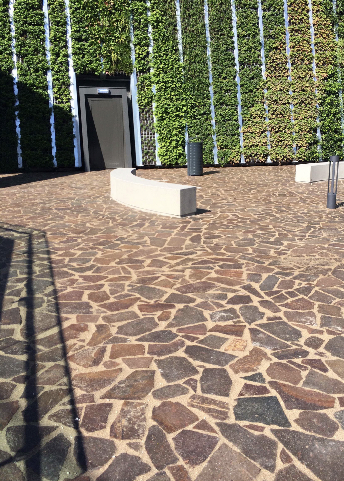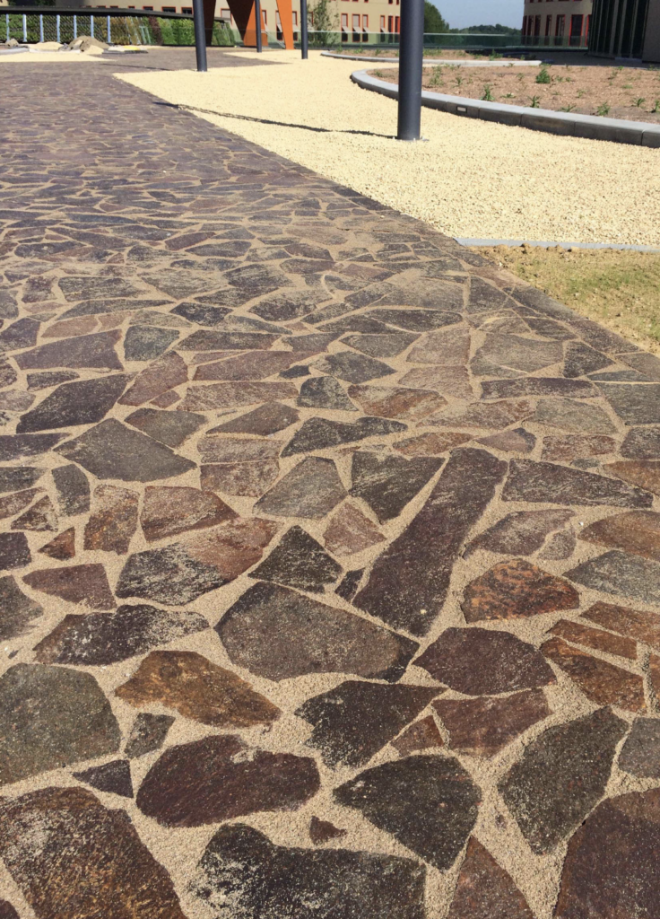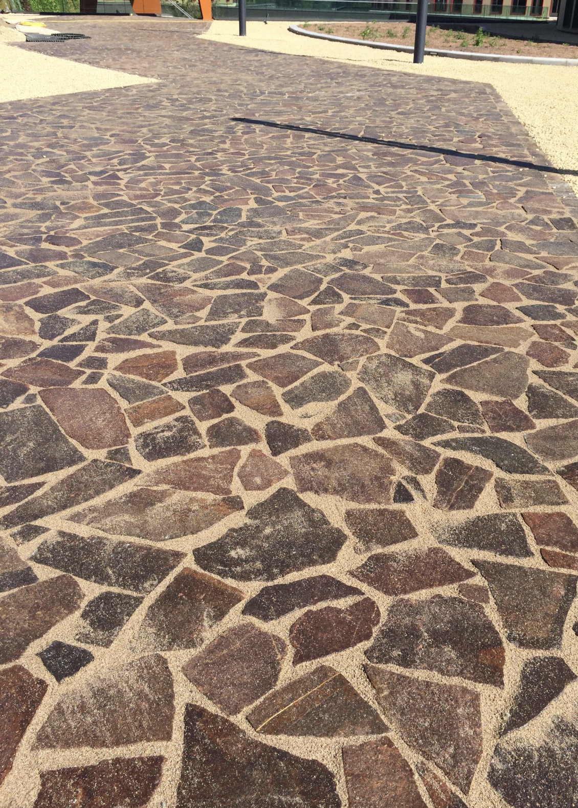 De Flagstones Porfier Gigante dienen verwerkt te worden in de specie. Op deze manier komen de breukstukken goed stabiel te liggen en kunnen ze netjes afgevoegd worden met zand en cement.