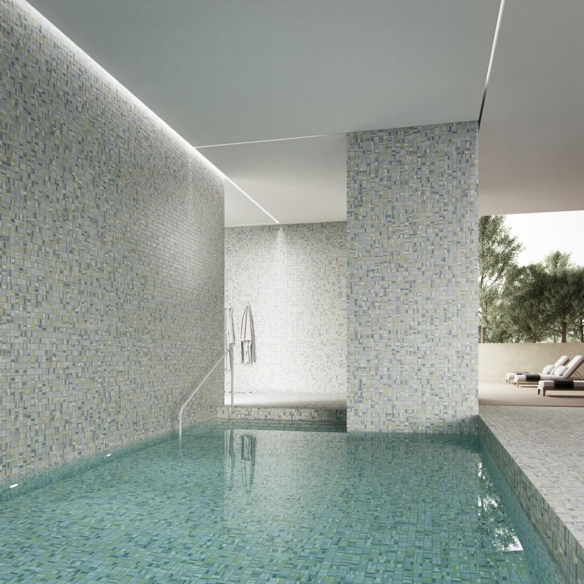 Deze Pigment glasmozaïek kan in elke ruimte toegepast worden en is door zijn kleur in het bijzonder geschikt voor badkamers, zwembaden, sauna’s en in een wellness.