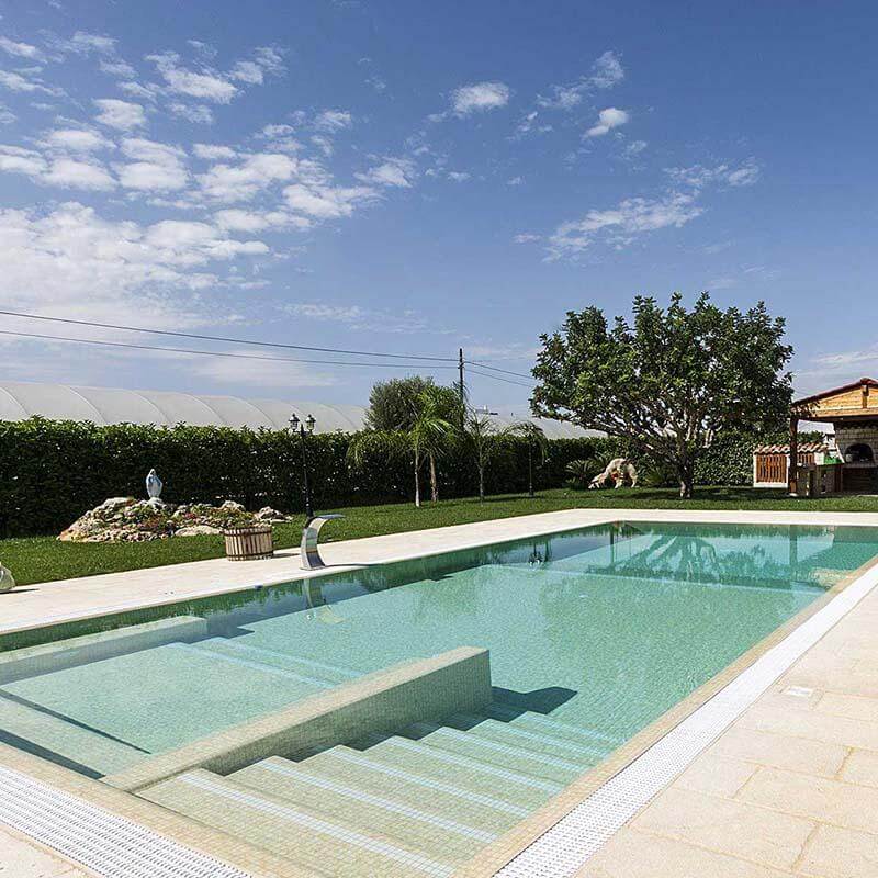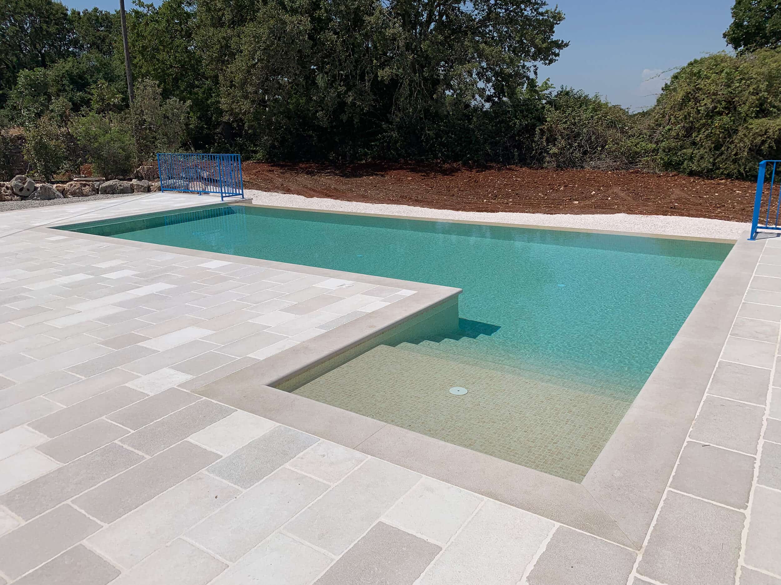 De gehele Zen serie is gebaseerd op natuurlijke materialen zoals steen, marmer en hout. Zo ook de Zen Sandstone glasmozaïek. Deze mozaïek is geïnspireerd op kalkzandsteen uit Zuid Frankrijk. Het rauwe karakter van de Zuid-Franse materialen zie je direct terug in de beige geschakeerde glasmozaïek. In combinatie met een zwembadrand gemaakt van Bourgondische Dallen, is dit echt een pareltje.