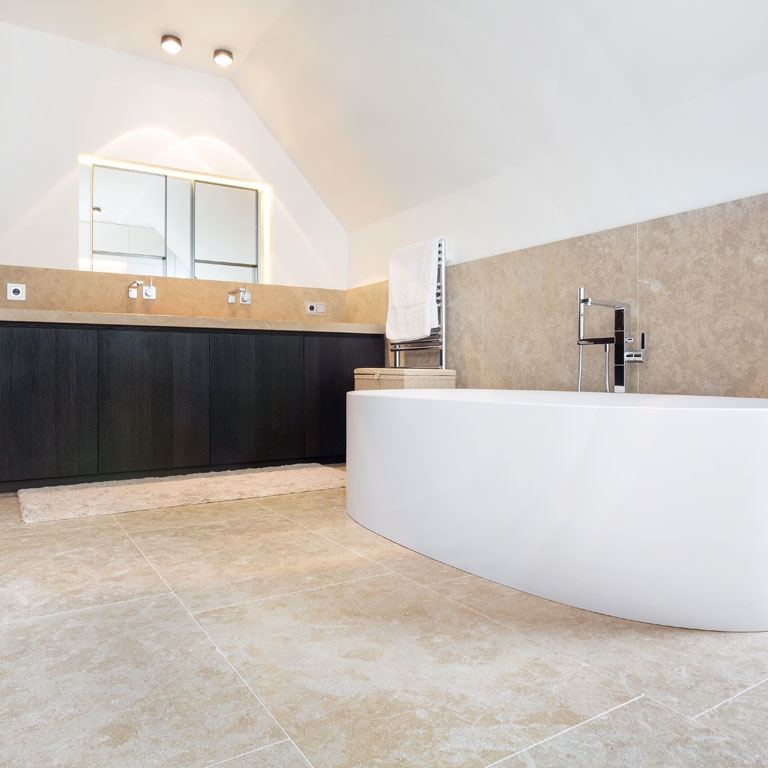 De Italian Beige Geborsteld is prachtig op de vloer. Deze tegel is echter ook schitterend tegen de wand. Zeker in een badkamer geeft dit een prachtige luxe uitstraling