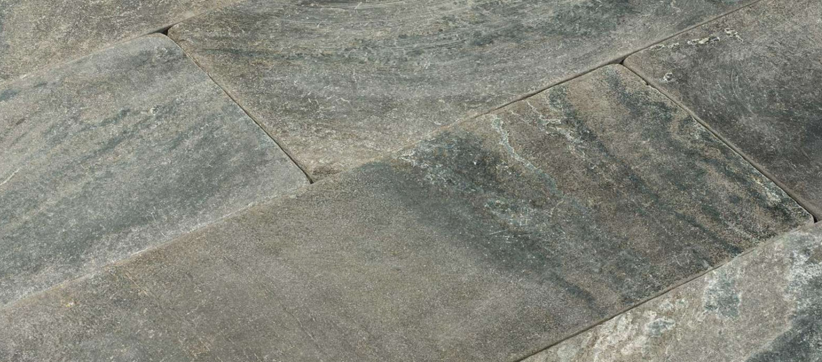 De Jericho Carbon Black is een zeer sfeervolle en verouderde kwartsiet terrastegel.