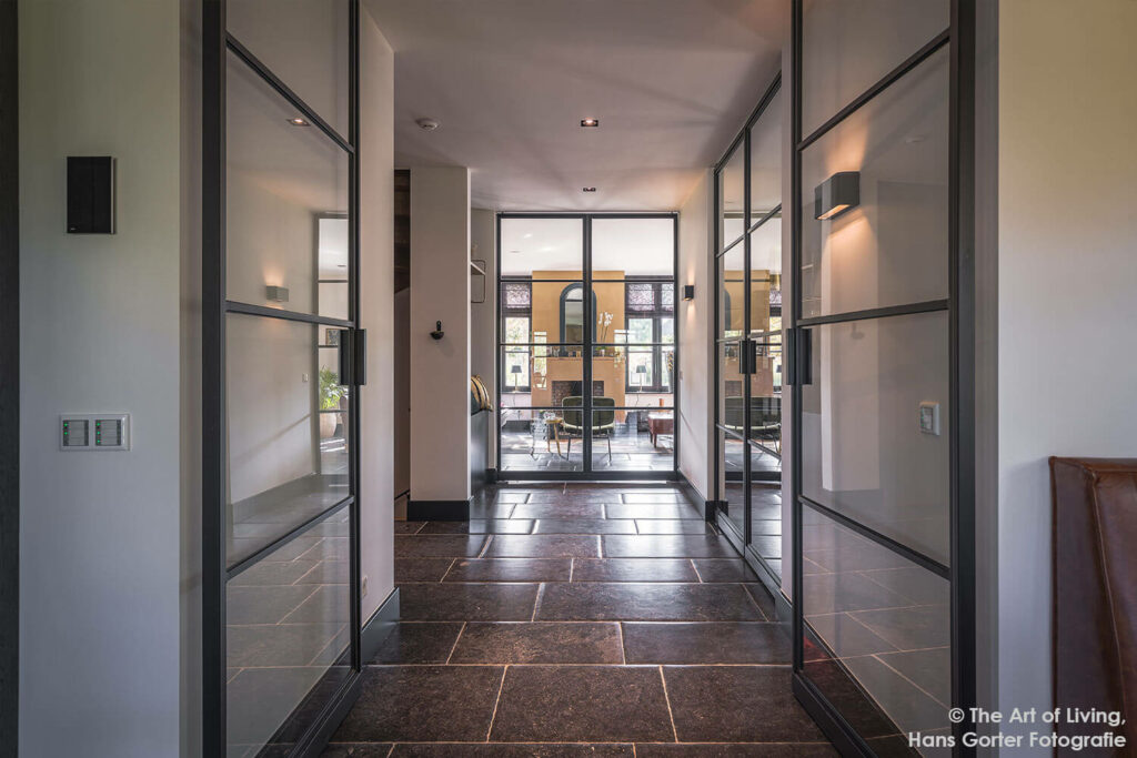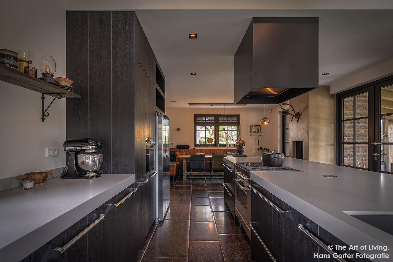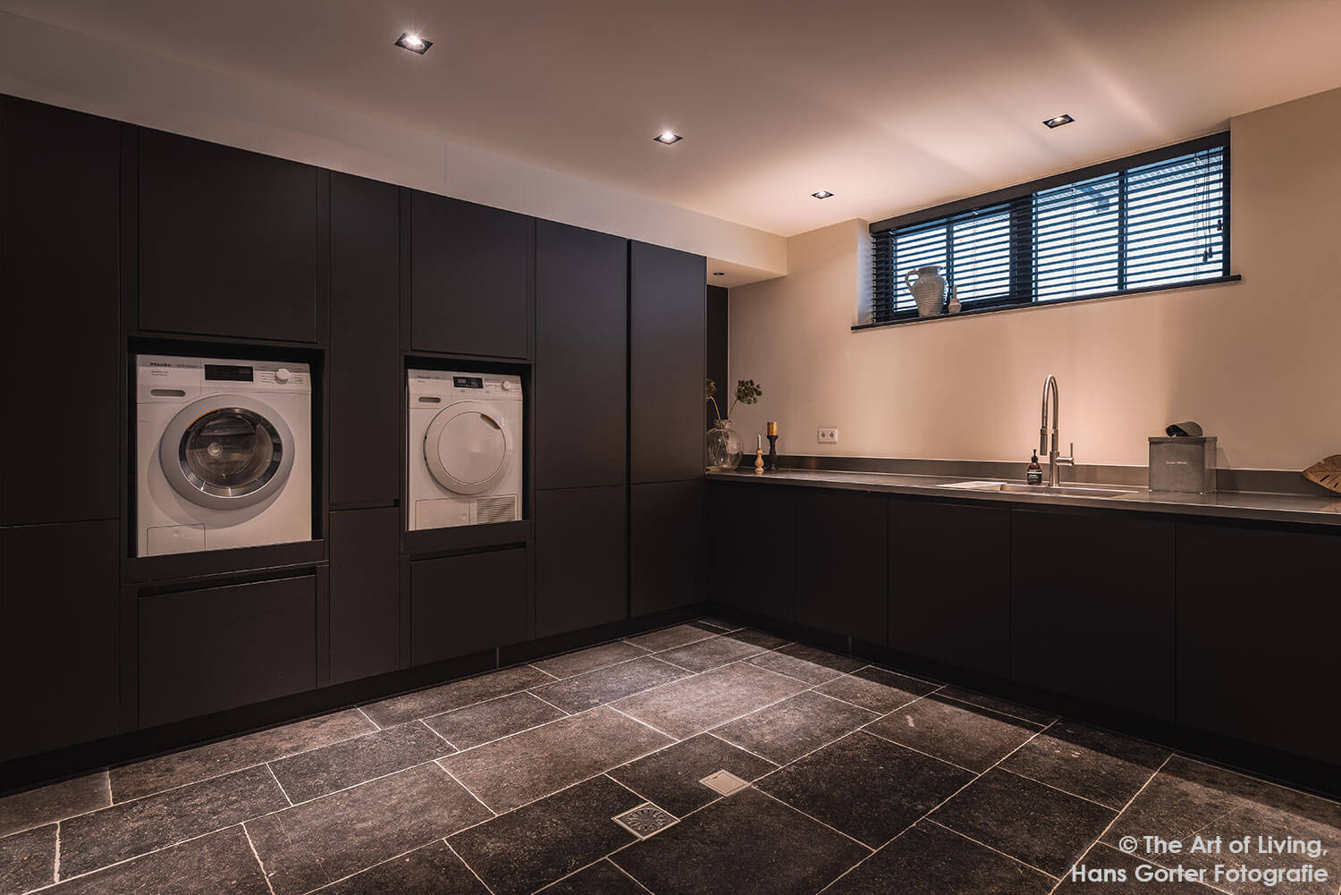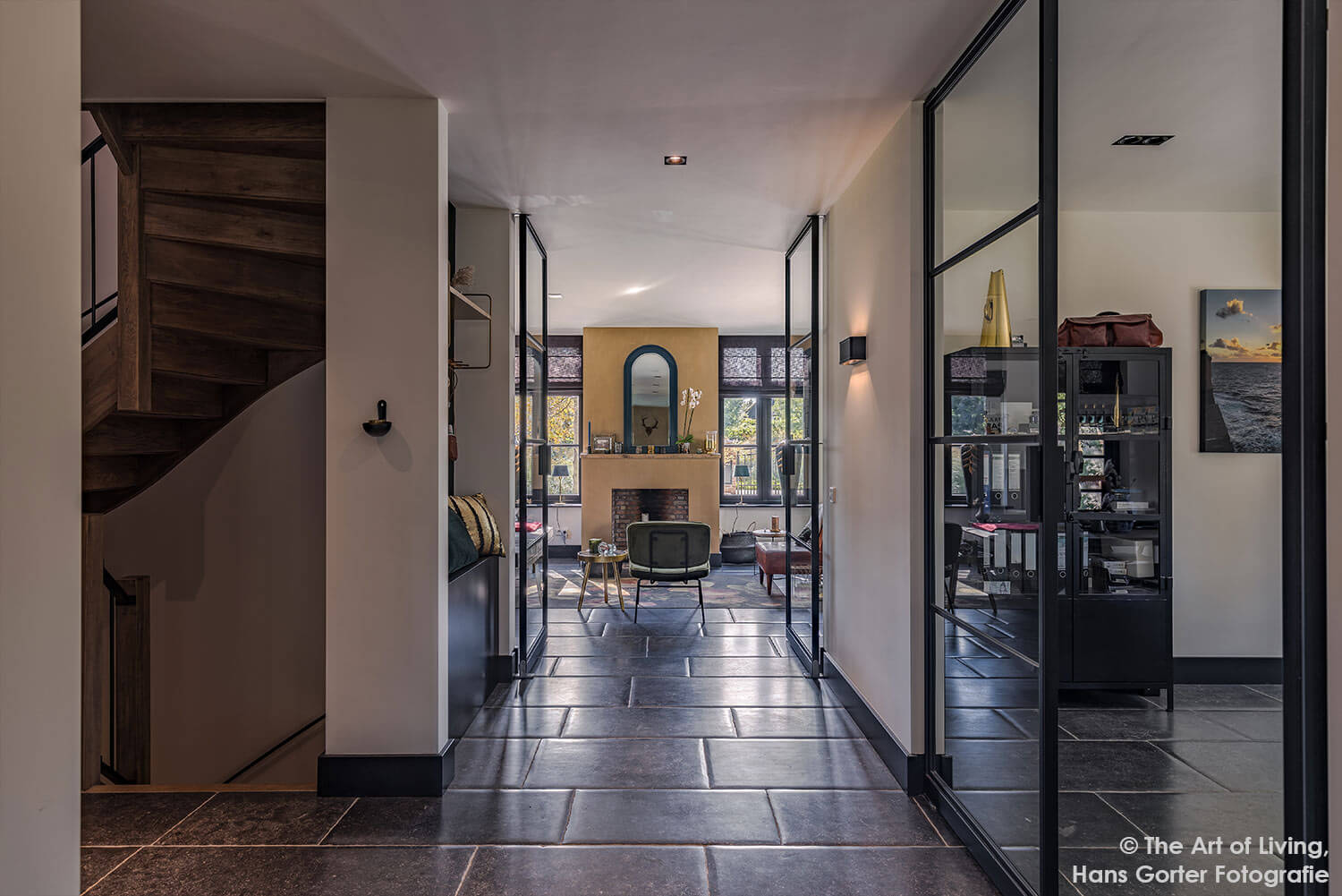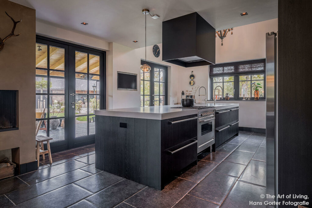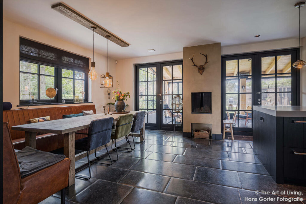 Voor de vloer in de woonkamer, keuken, serre en badkamer is er gekozen voor een Belgisch hardsteen in een “Monastery Finish”. Dit is een prachtige afwerking waarbij de de zijdes ingezaagd en gebroken worden, waarna de zijdes licht bol geschuurd worden. Deze Belgisch Hardsteen Monastery Dark werd geleverd op banen van 40 en 50 cm breed met wisselende lengtes. Hierdoor ontstaat er een speels banen verband.