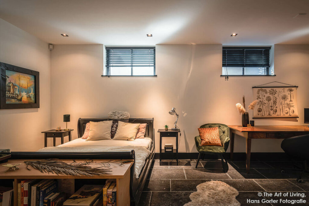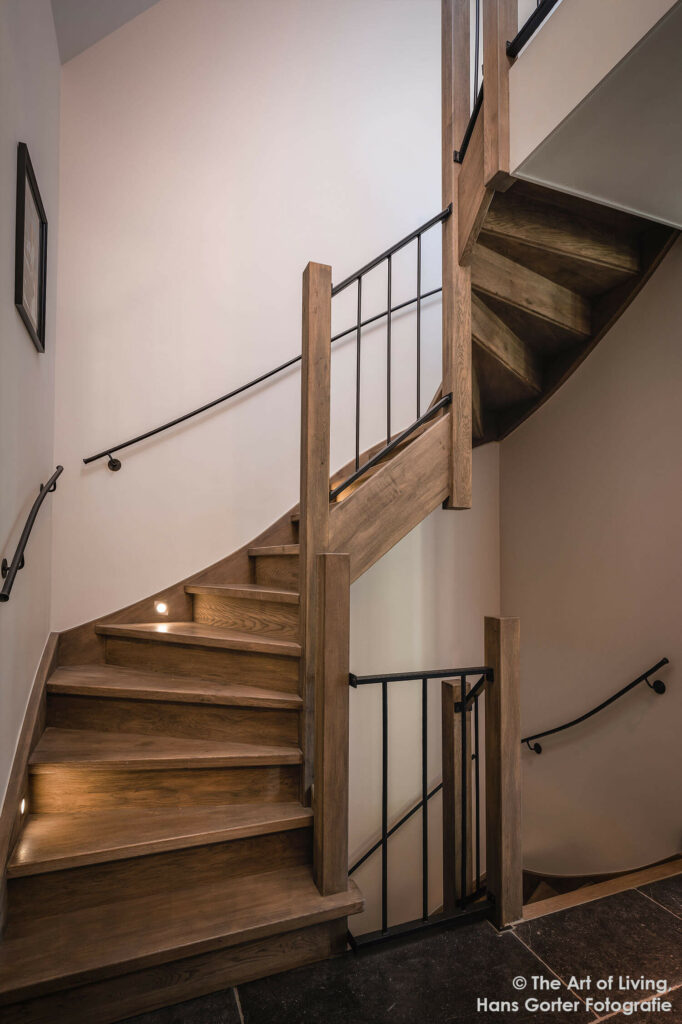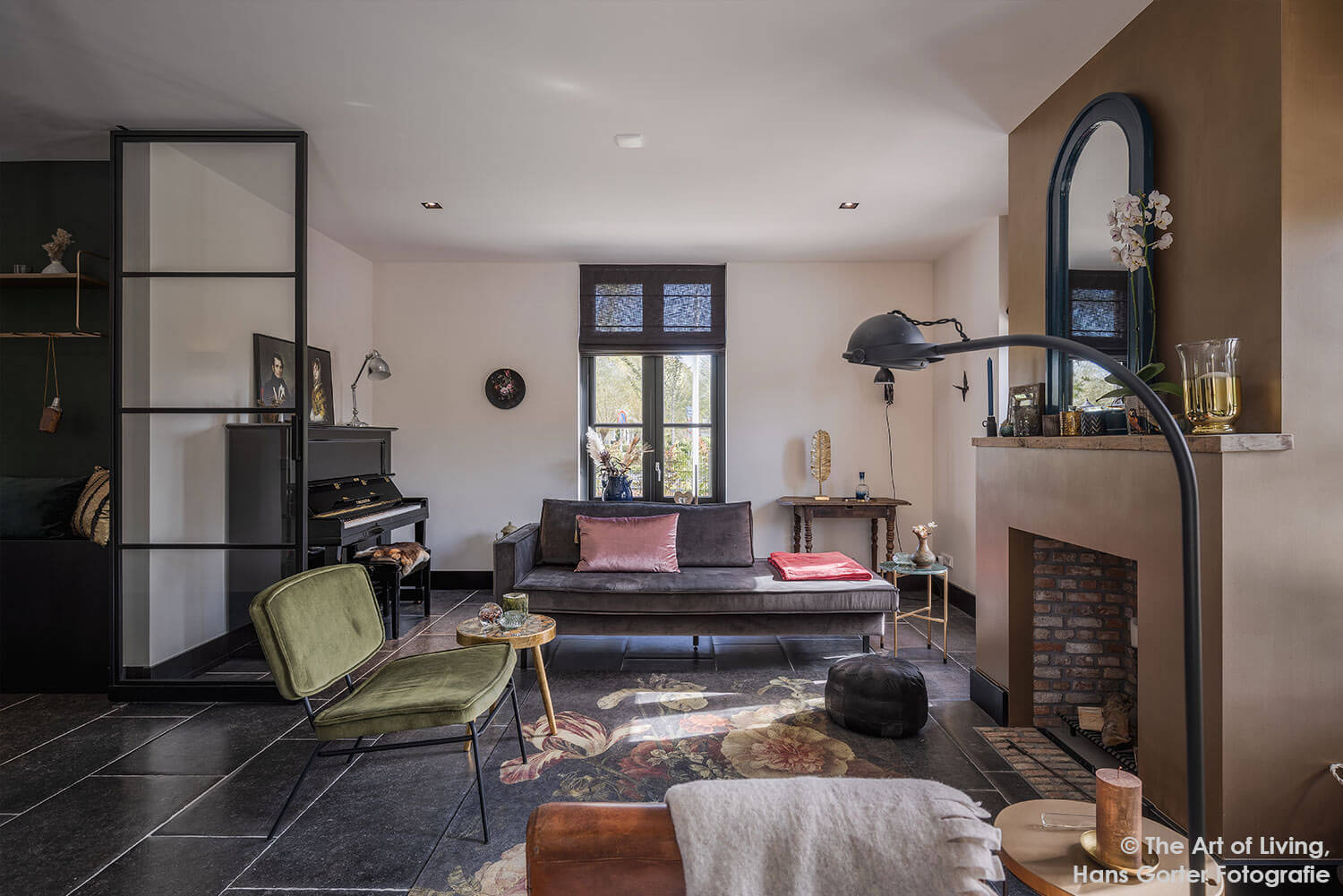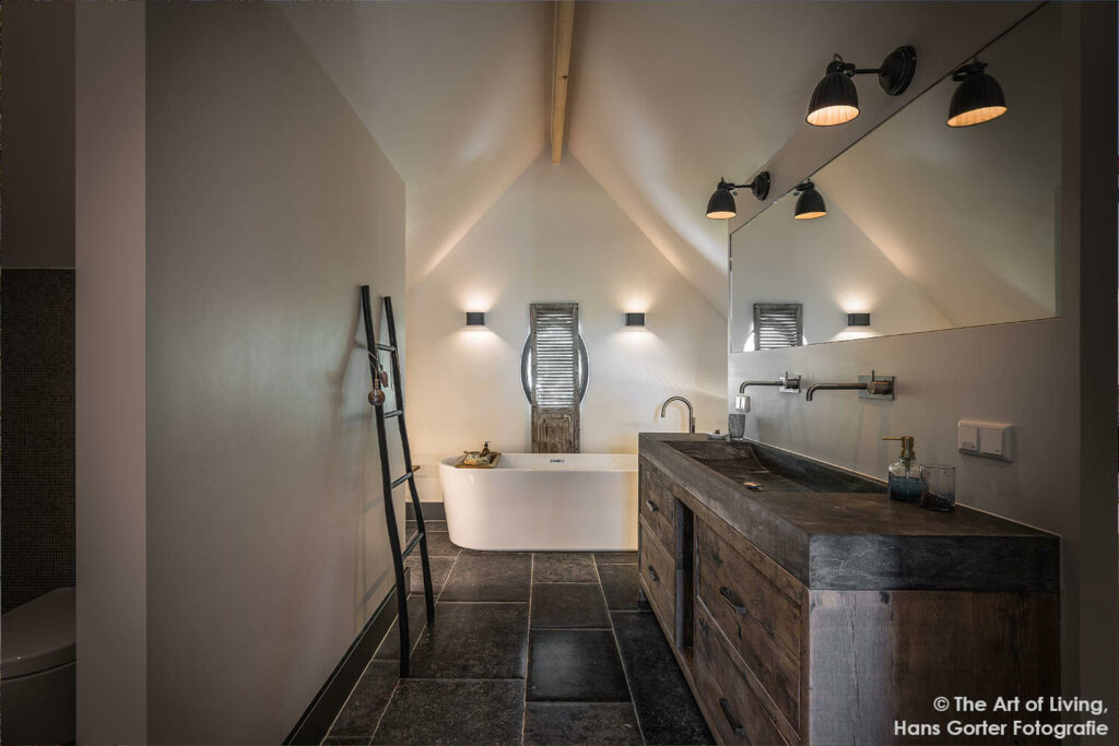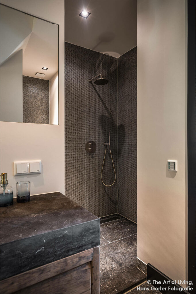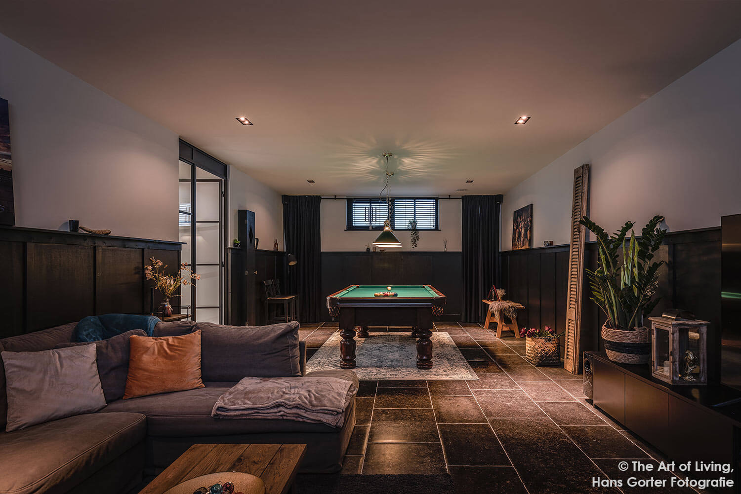 Voor de vloer in de woonkamer, keuken, serre en badkamer is er gekozen voor een Belgisch hardsteen in een “Monastery Finish”. Dit is een prachtige afwerking waarbij de de zijdes ingezaagd en gebroken worden, waarna de zijdes licht bol geschuurd worden. Deze Belgisch Hardsteen Monastery Dark werd geleverd op banen van 40 en 50 cm breed met wisselende lengtes. Hierdoor ontstaat er een speels banen verband.
