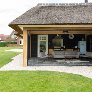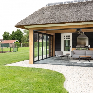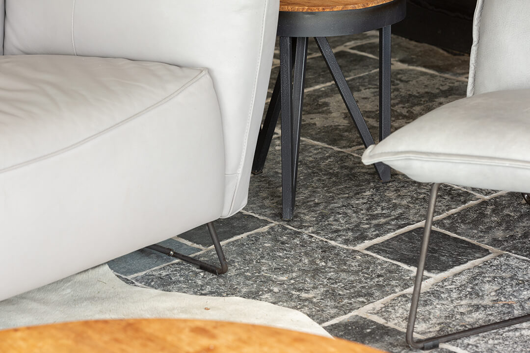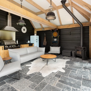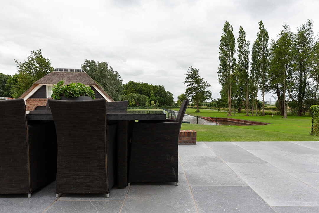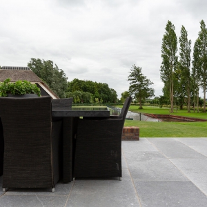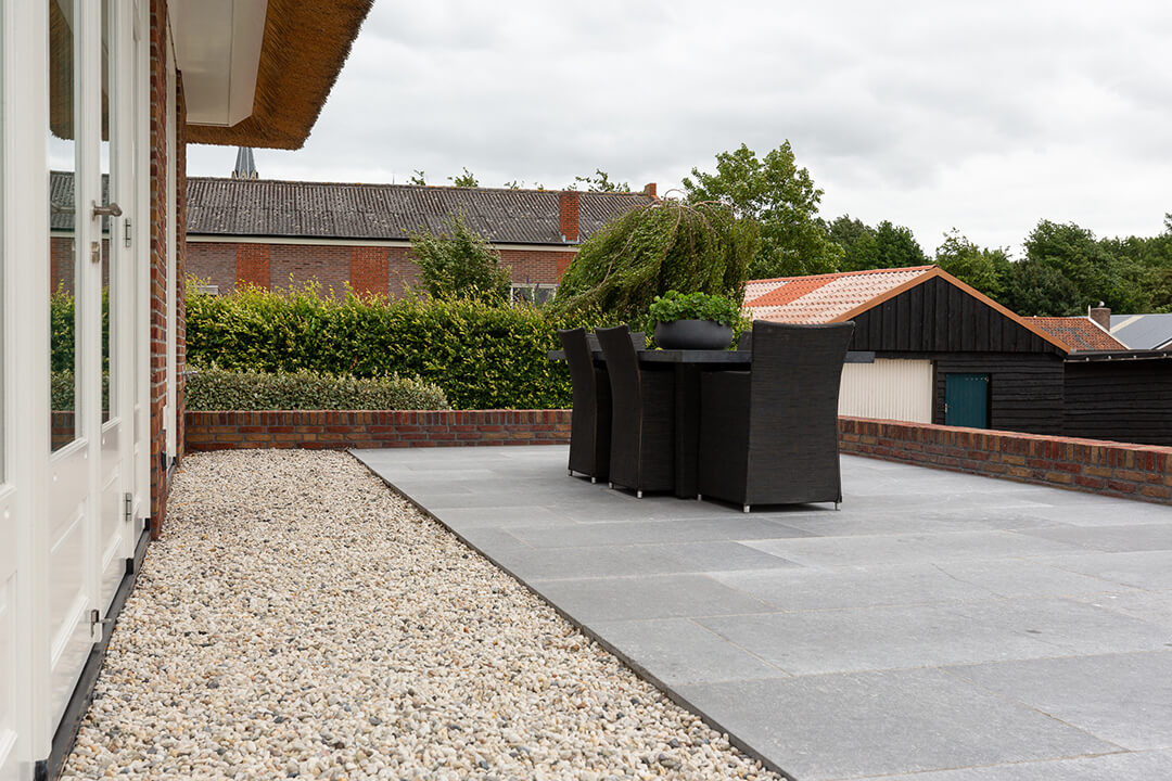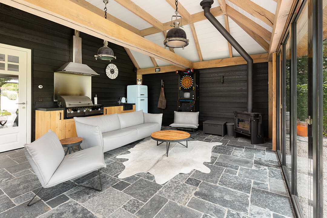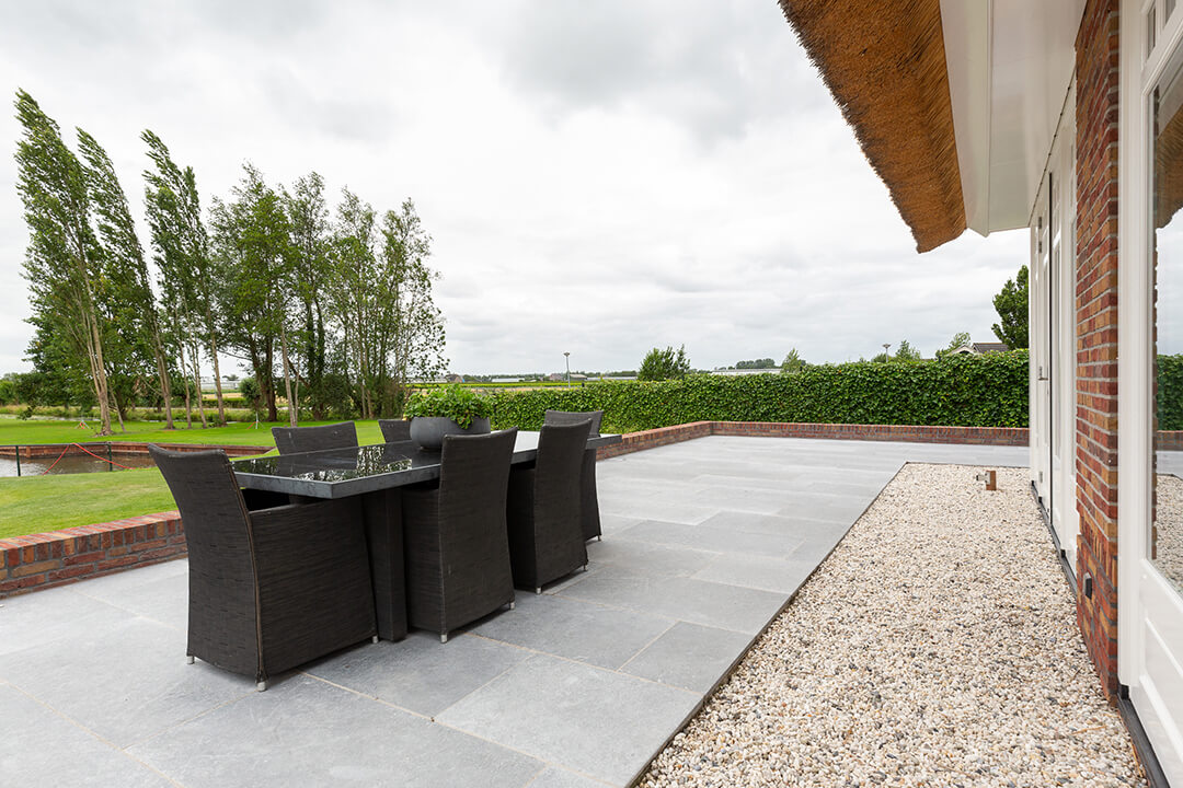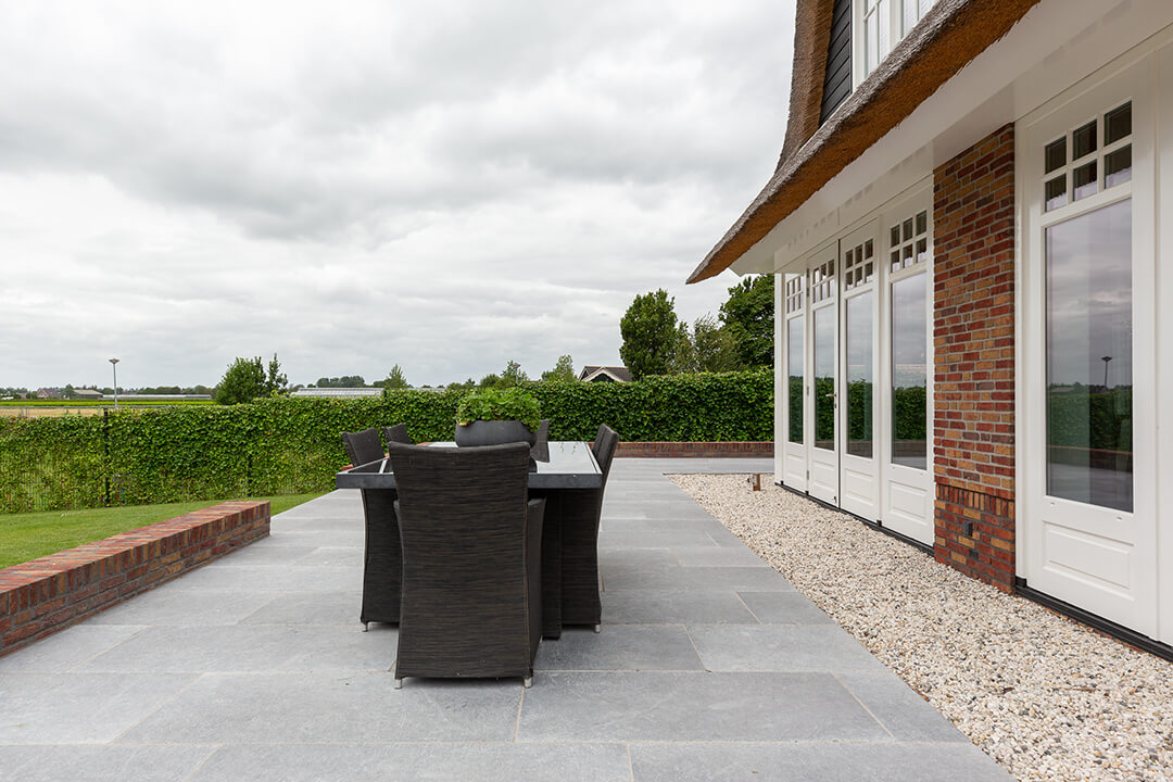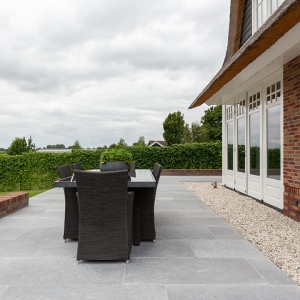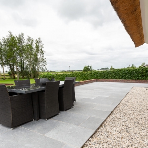 In het buitenverblijf is gekozen voor een kei harde vloer van kerkdallen. Deze kerdallen zijn 3 cm dik en worden geleverd in een Romaans verband.