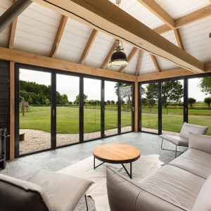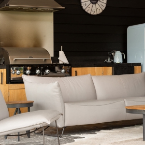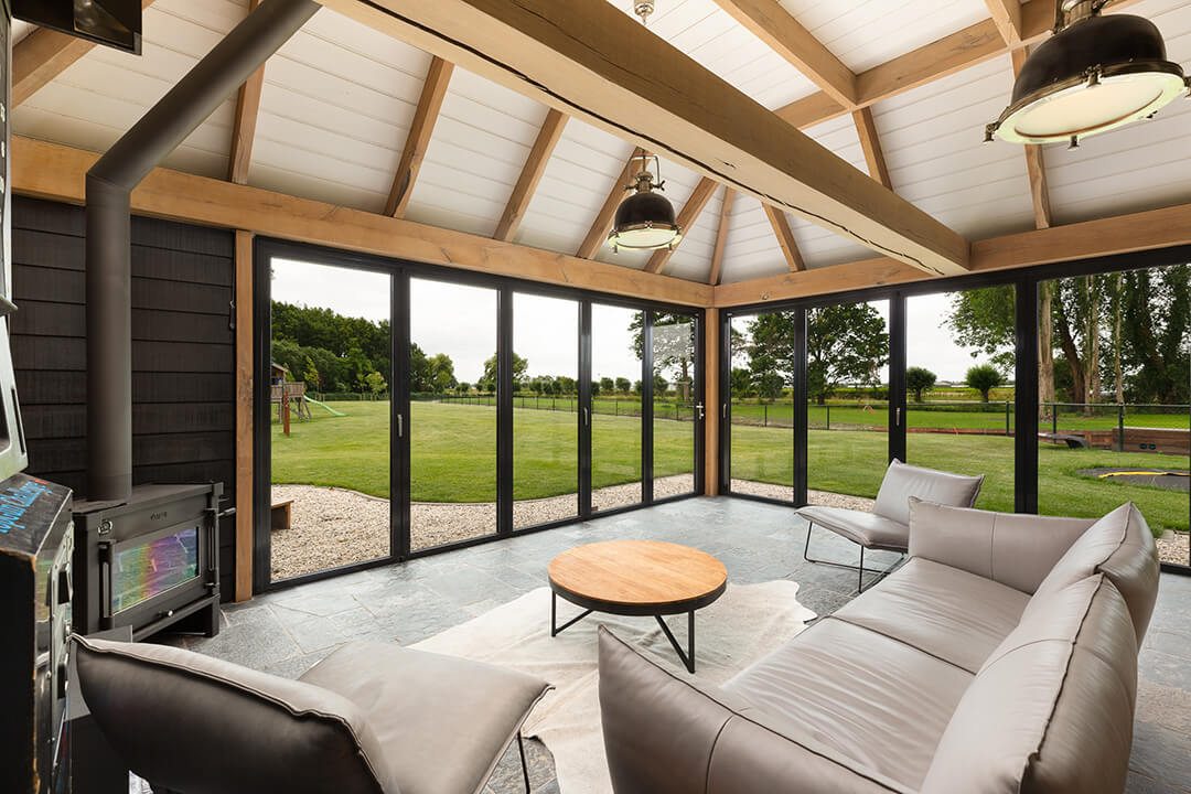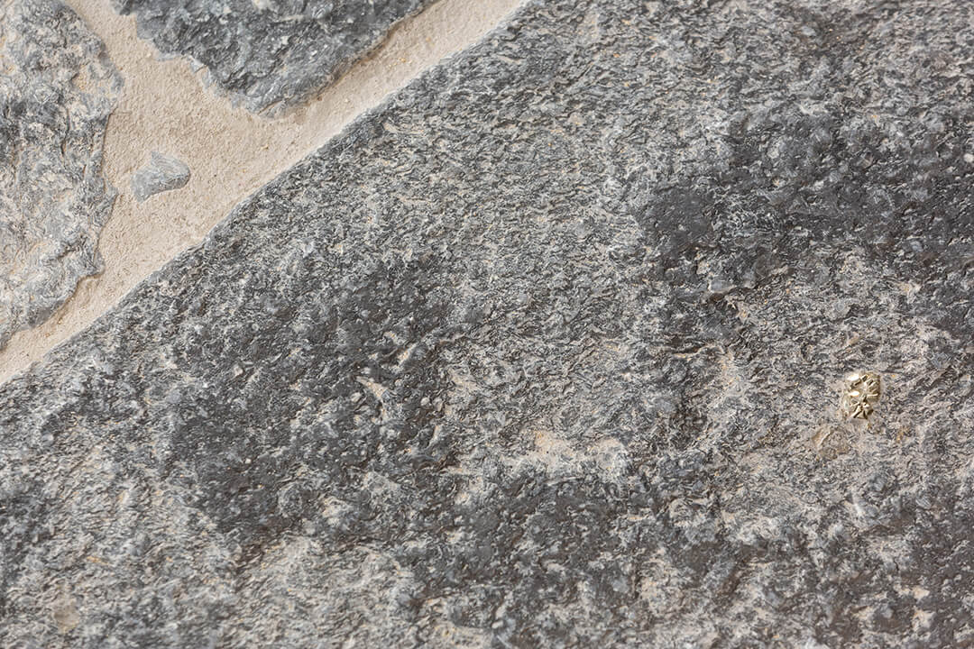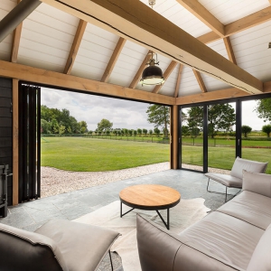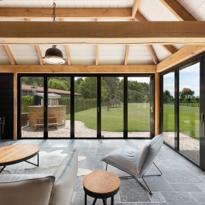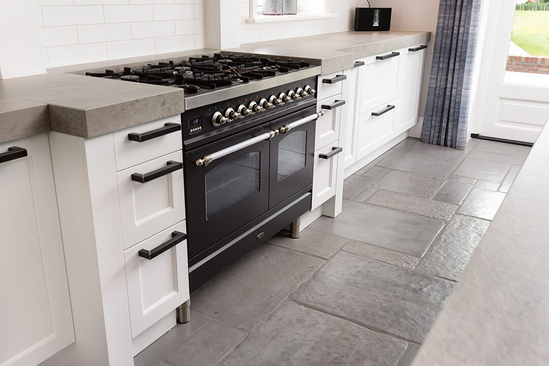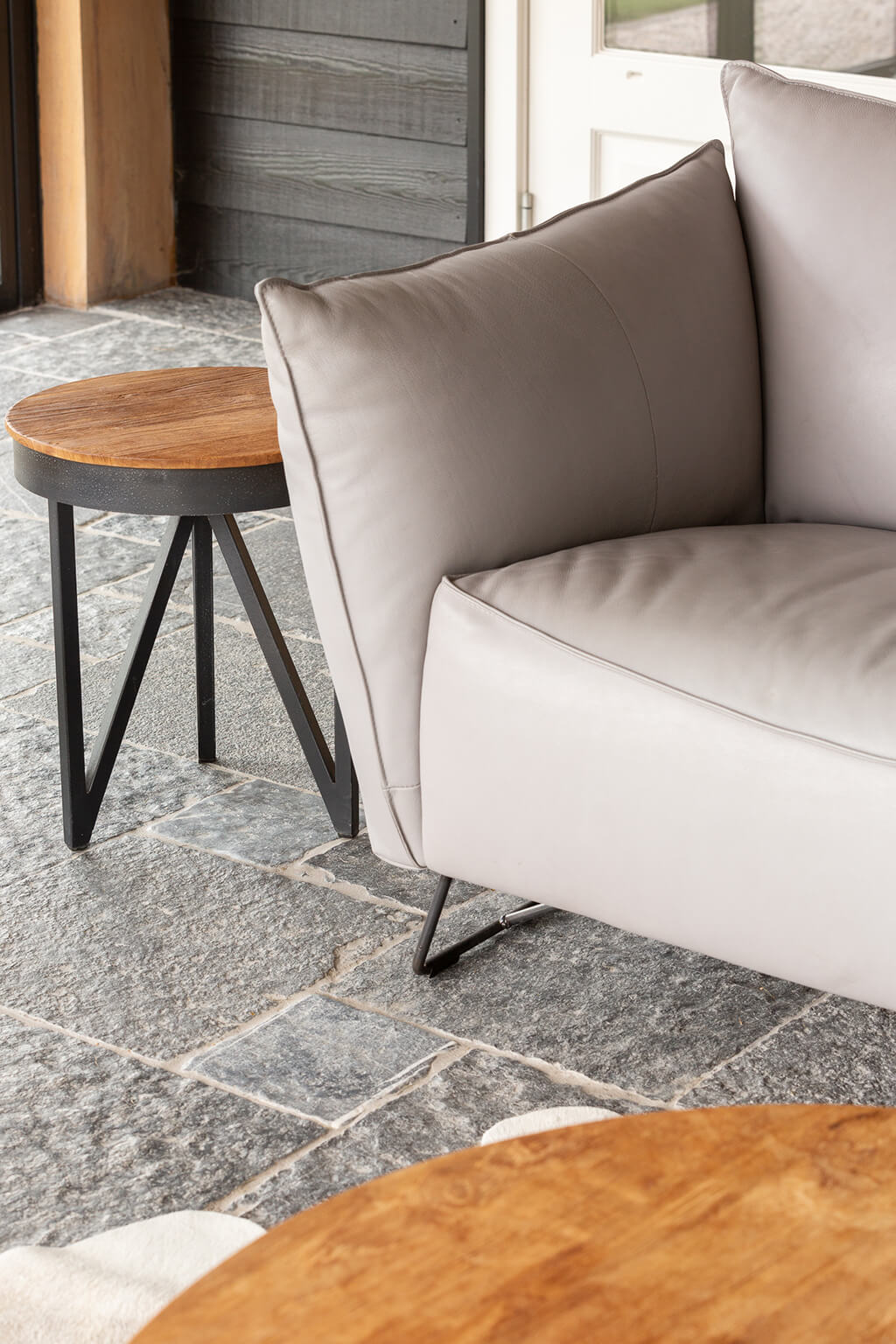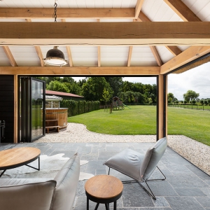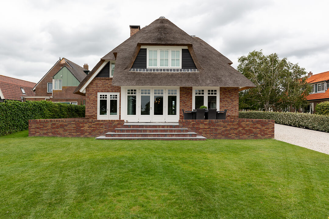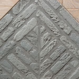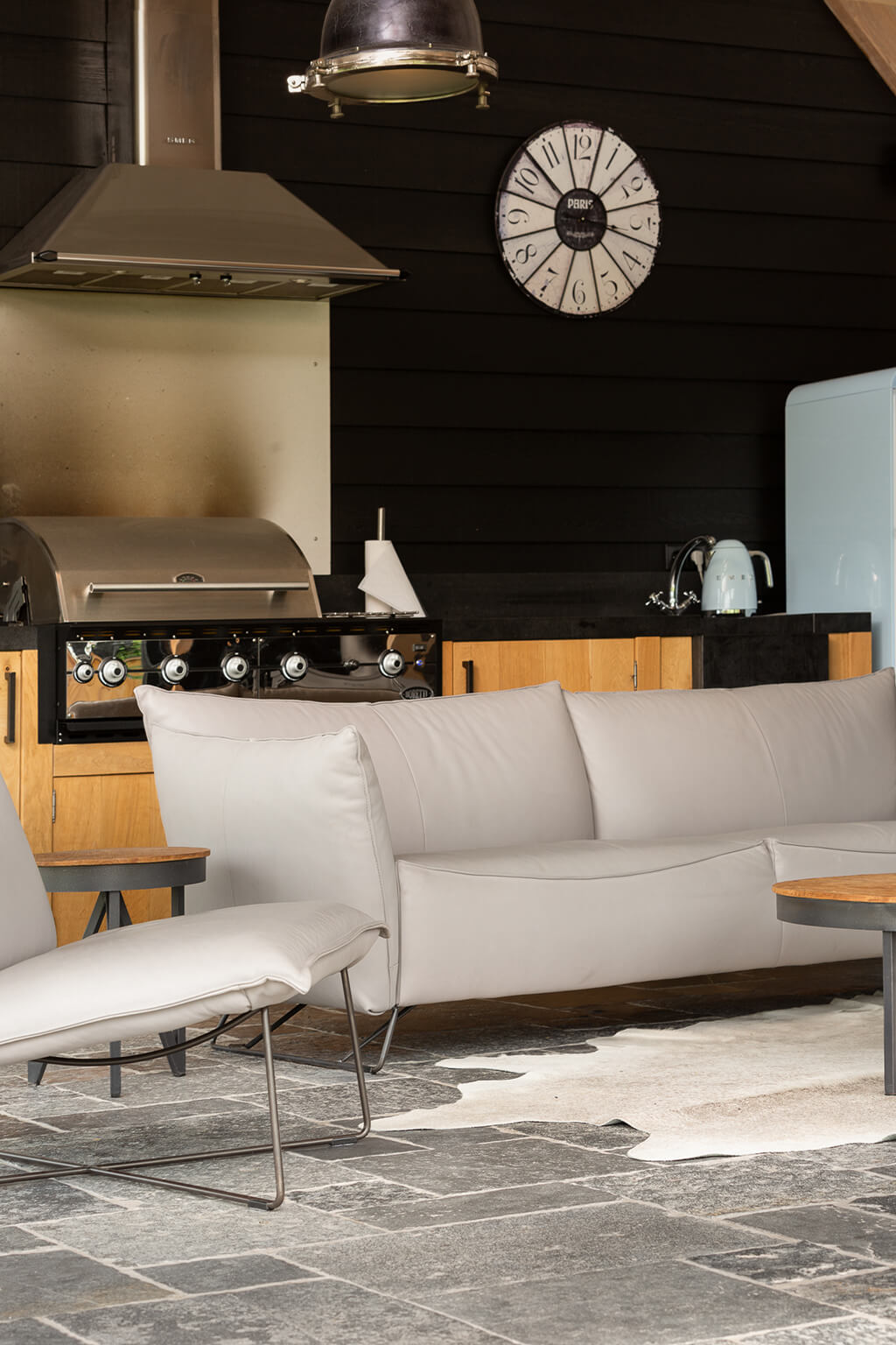 In het buitenverblijf is gekozen voor een kei harde vloer van kerkdallen. Deze kerdallen zijn 3 cm dik en worden geleverd in een Romaans verband.