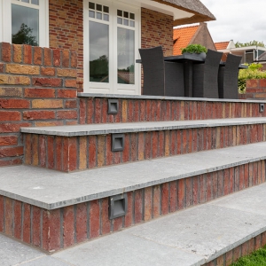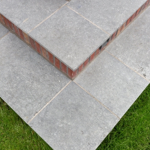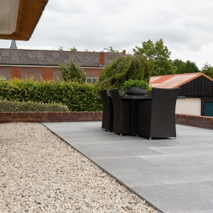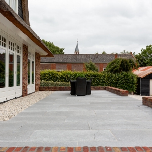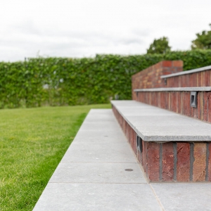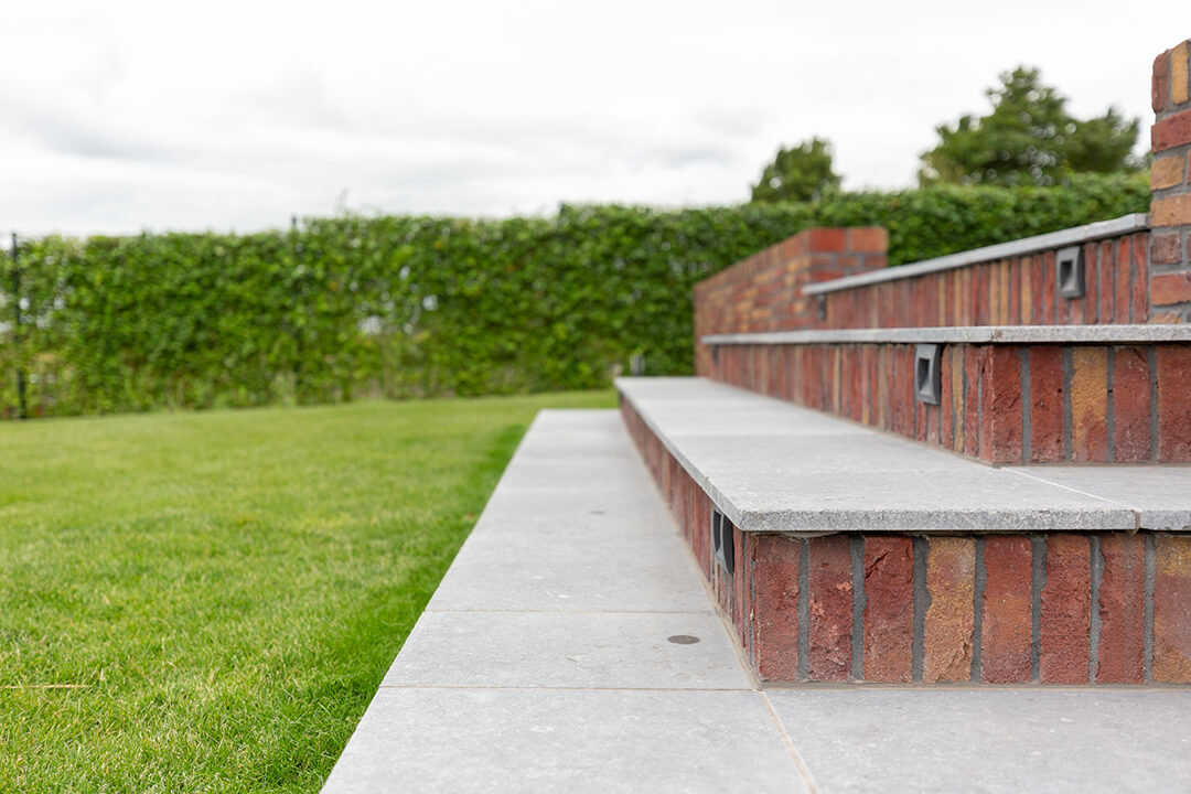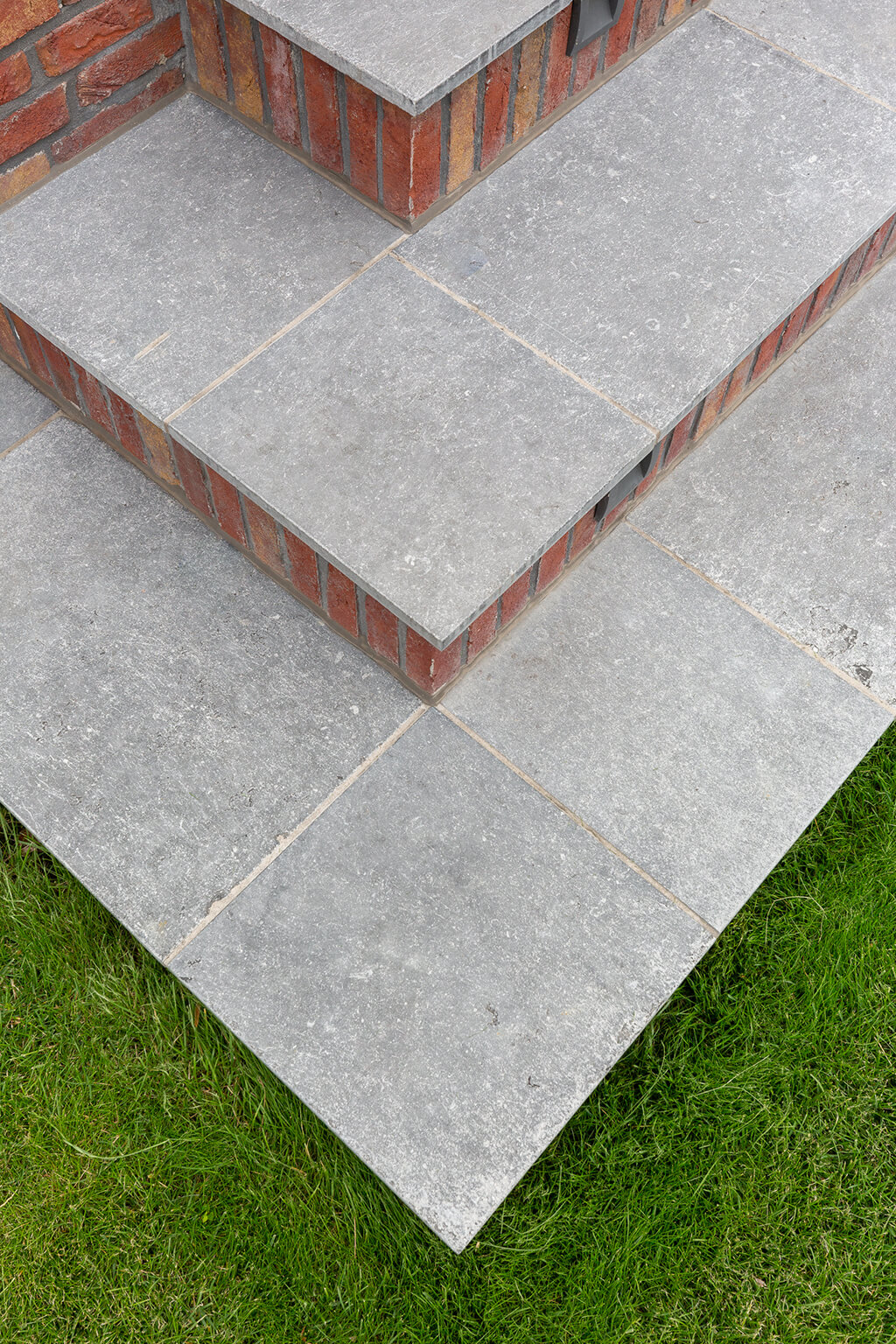 Op het terras is gekozen voor een Belgisch hardsteen Manueel Verouderd, Lichte Schuring in de maat 120×60 cm. Van dit zelfde materialen zijn de traptredes geproduceerd.
