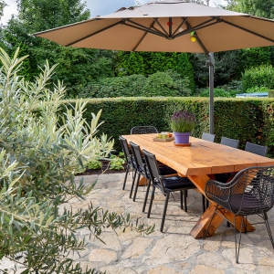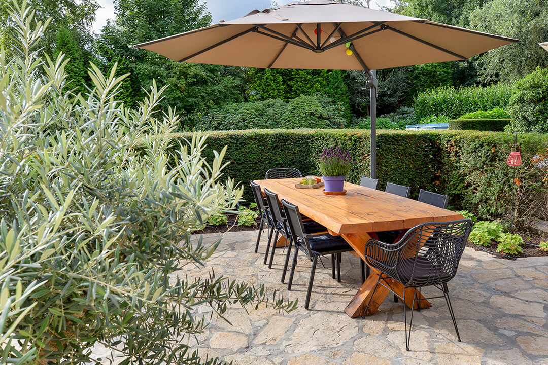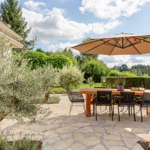 Voor een prachtig landelijk huis in Regio Eindhoven kwam deze klant onze showroom te Breda ons bezoeken. De klant wilde erg graag een mediterraans terras creëren, met een robuuste look. Samen zijn wij met de klant op zoek gegaan naar het perfecte materiaal voor deze prachtige tuin.