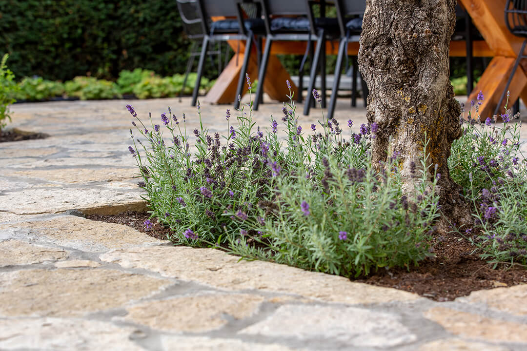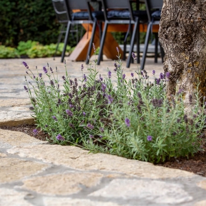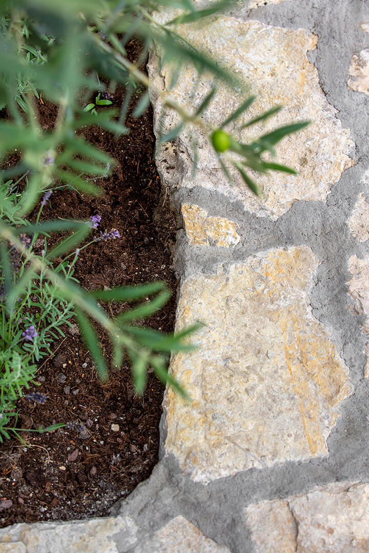 Zo is bijvoorbeeld de toplaag van de flagstone niet bewerkt in de groeve, waardoor deze de prachtige rauwe structuur heeft behouden. We hebben hier gekozen voor middelgrote flagstones qua formaat, zodat de speelsheid van de flagstones extra naar bovenkomt.