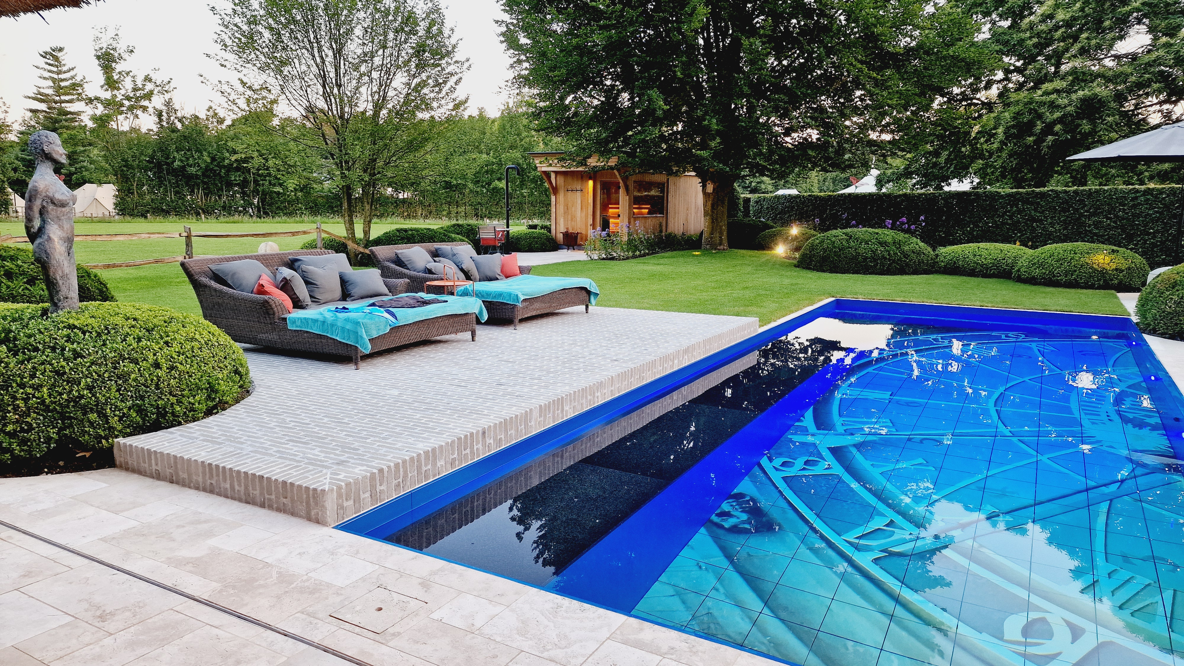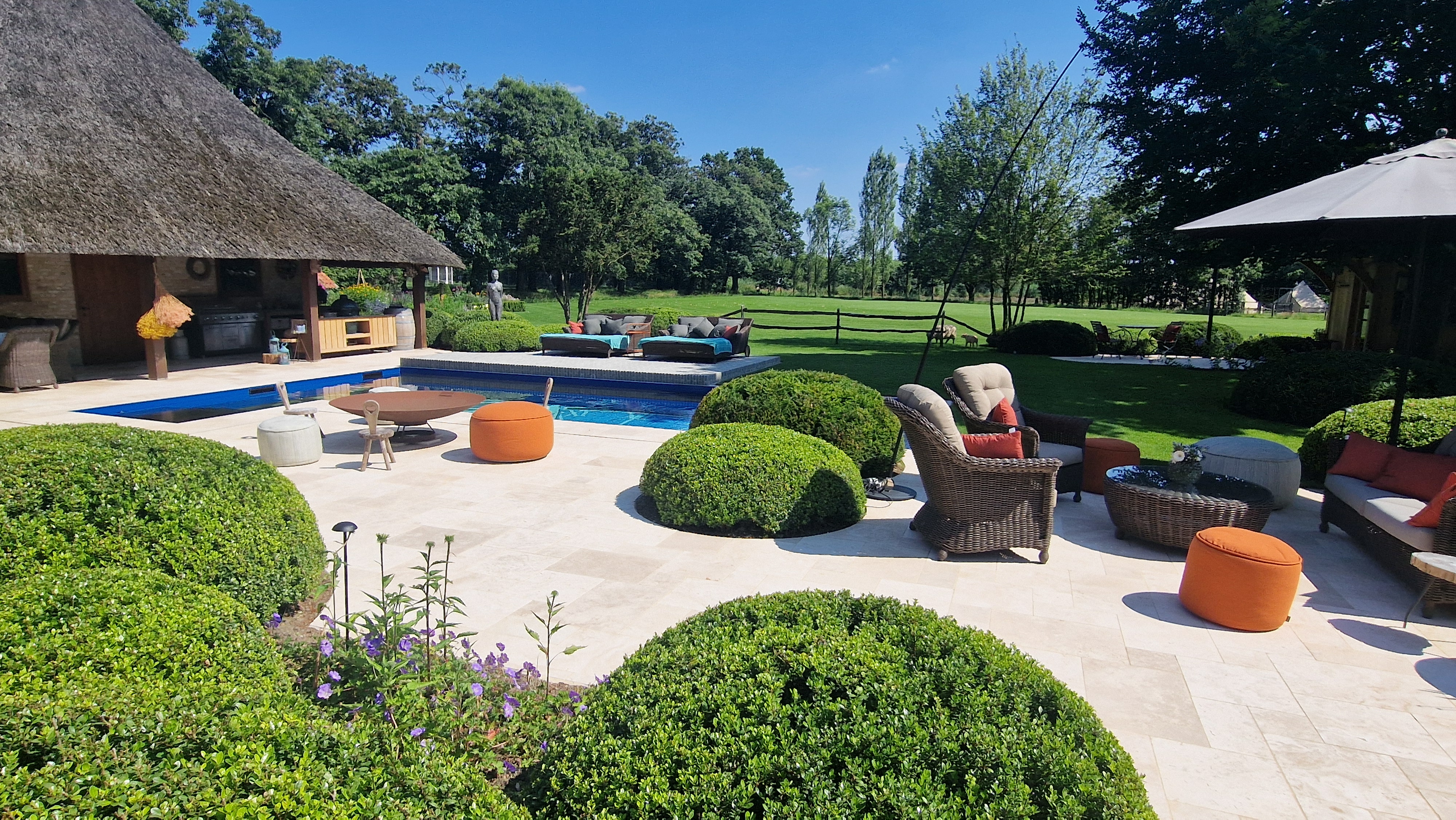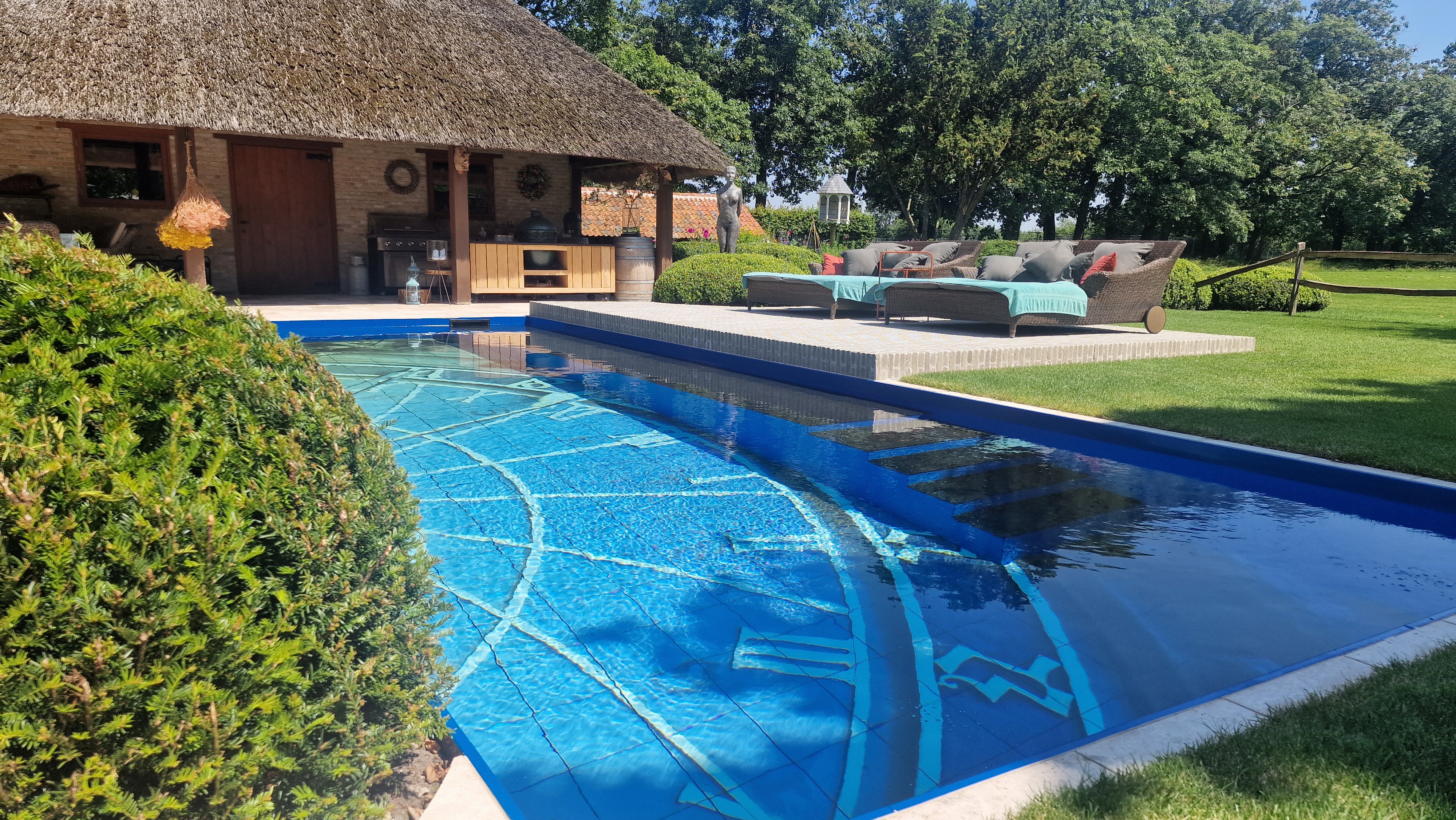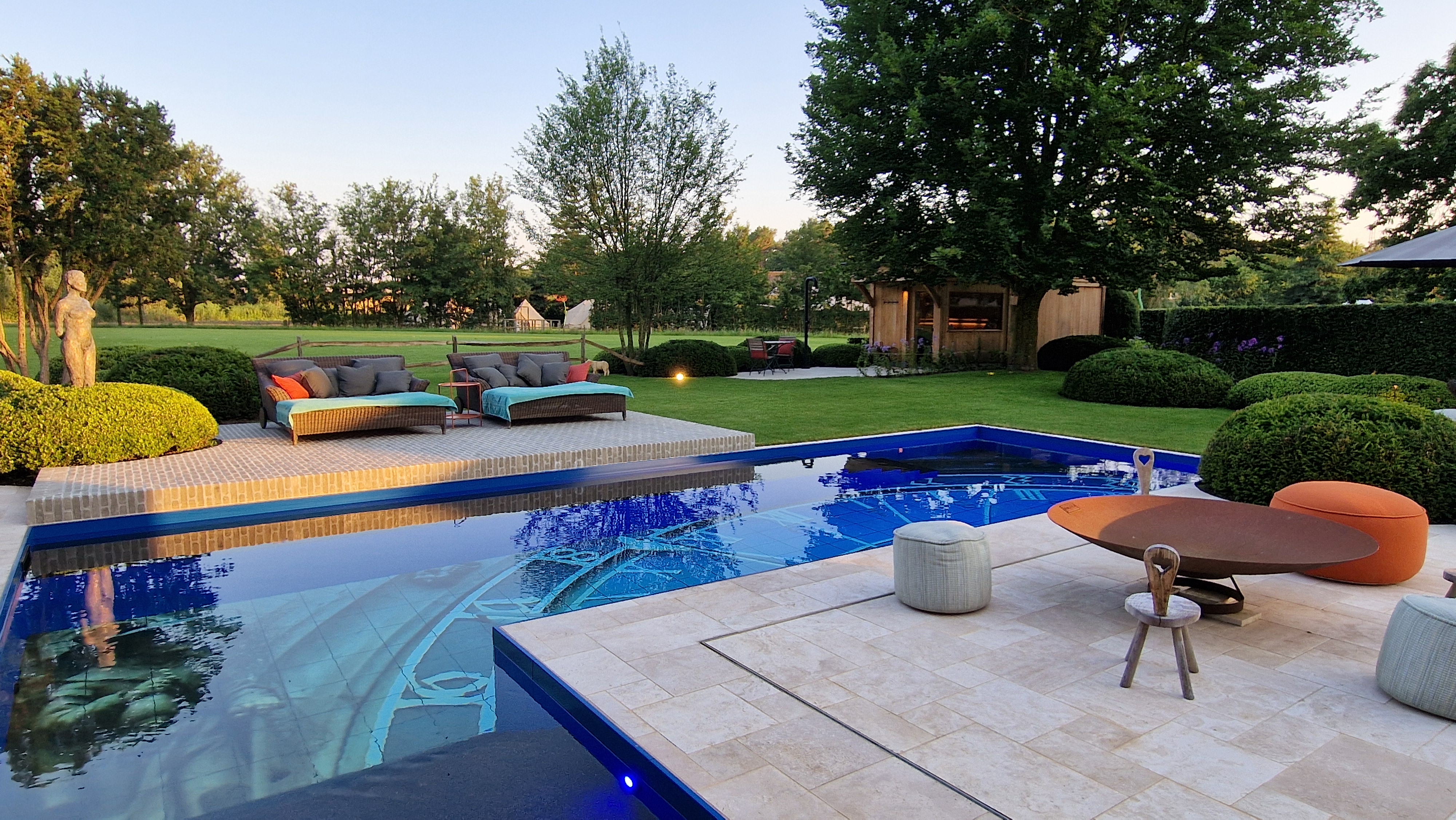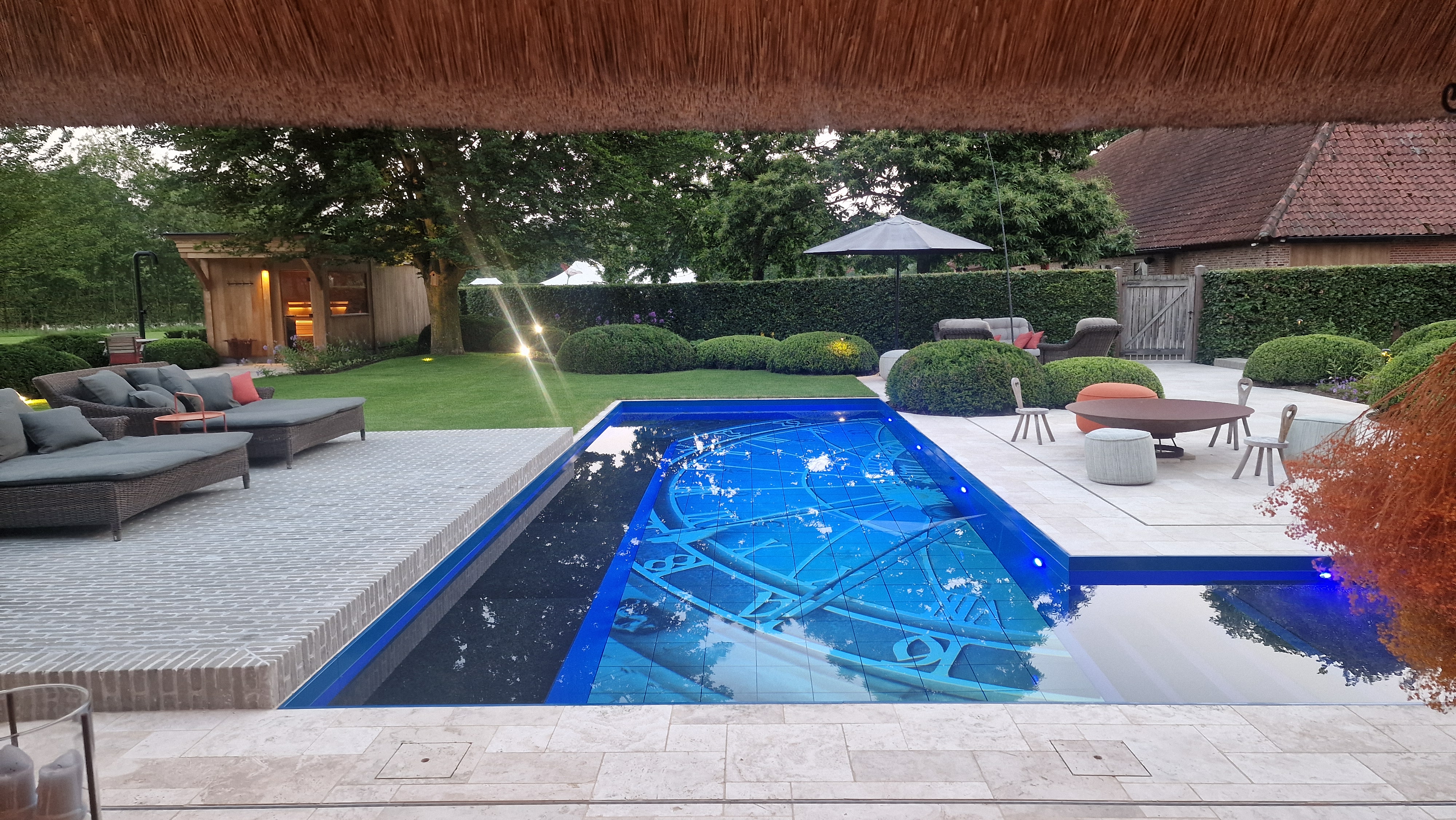 Een groot voordeel van de Travertin Apulia Ivory Beige Anticato is dat er van dit materiaal ook verschillende maatwerk elementen zijn zoals opsluitbanden en zwembadranden. Iets wat ook in dit project goed uitkwam.