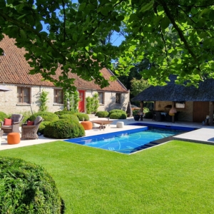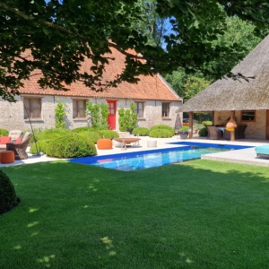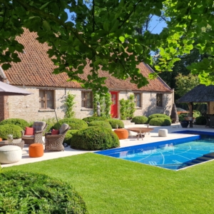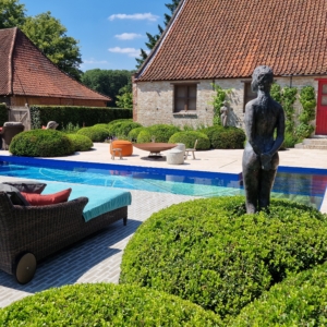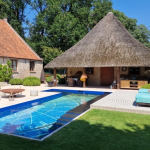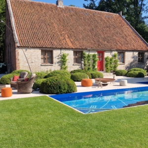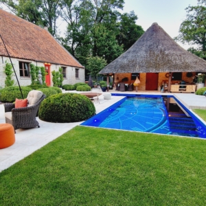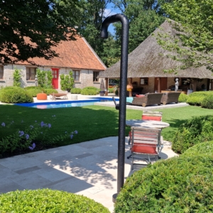 De mensen van dit prachtige landgoed wisten precies wat ze wilden. Namelijk een beige natuursteen met een verouderde afwerking, die de nostalgische uitstraling van de boerderij en de omgeving recht aandoet. Deze werd uiteindelijk gevonden in onze Travertin Apulia Ivory Beige Anticato. Een prachtige beige Travertin die ongestopt en getrommeld wordt geleverd. De Travertin Apulia Ivory Beige Anticato is hier geleverd in een klein Romaansverband, met een dikte van 3 cm.