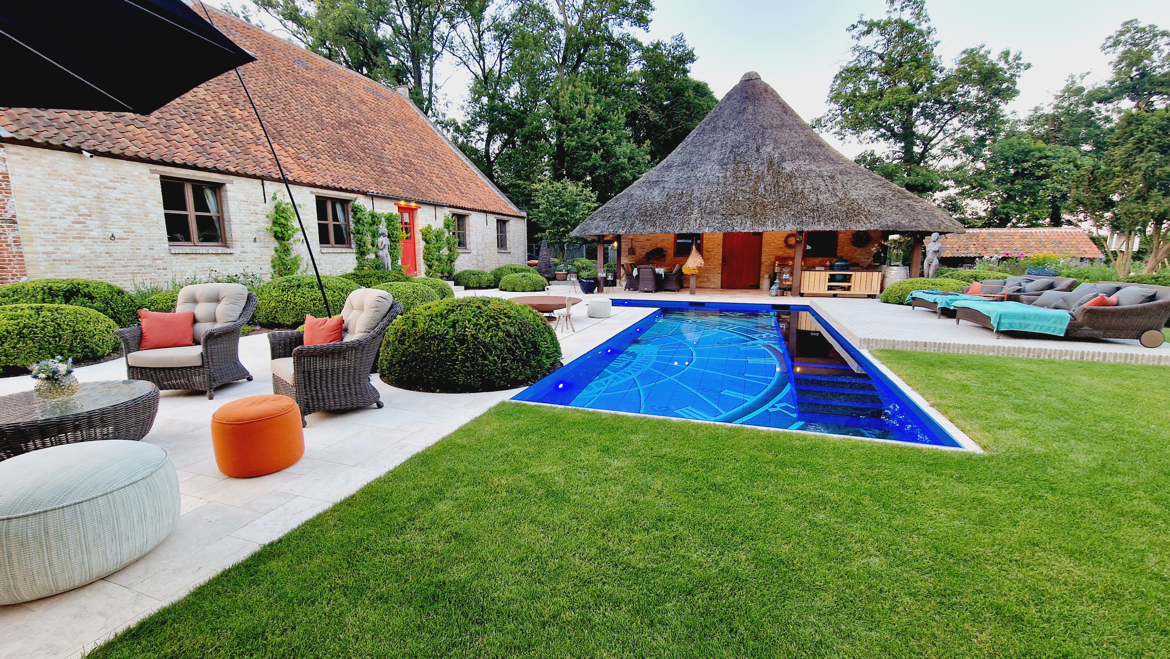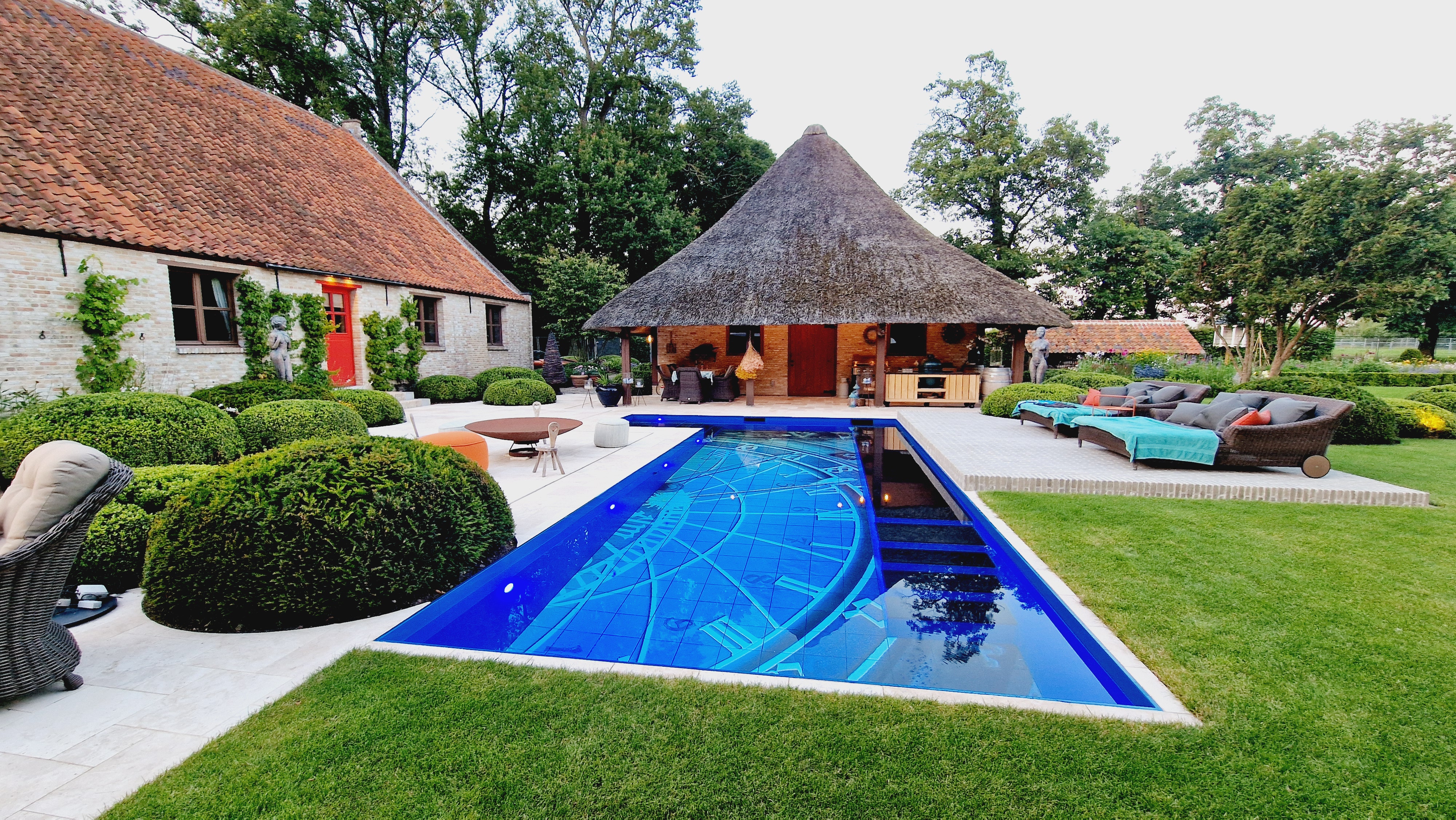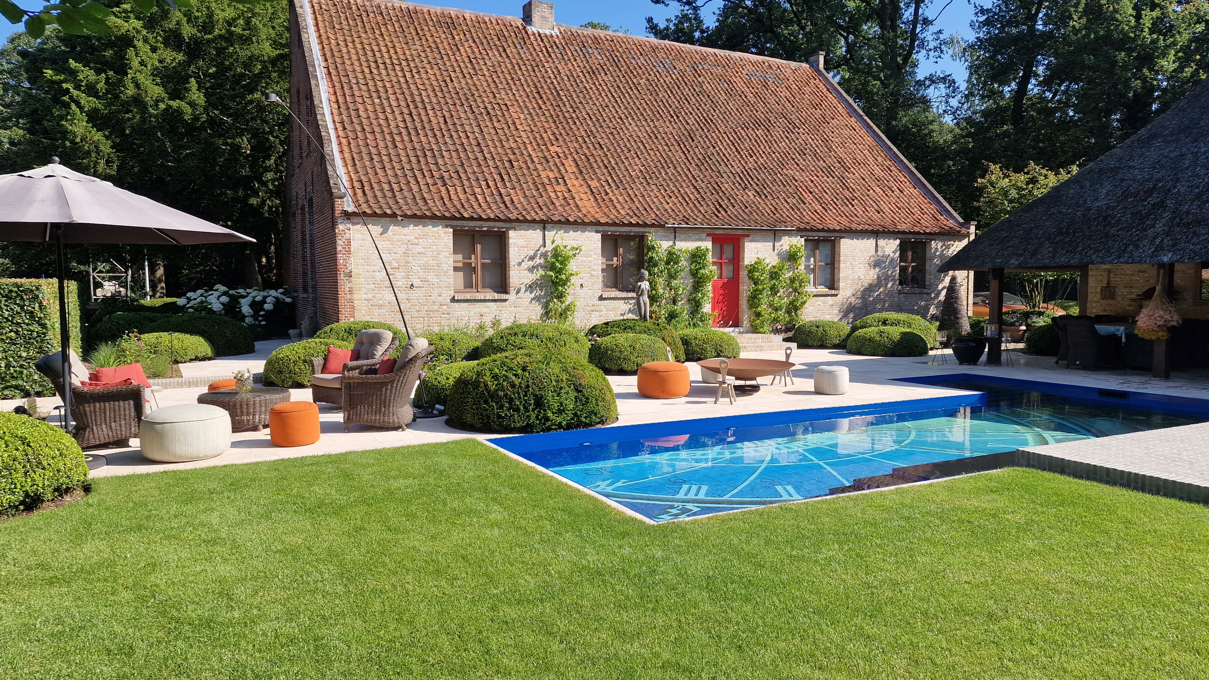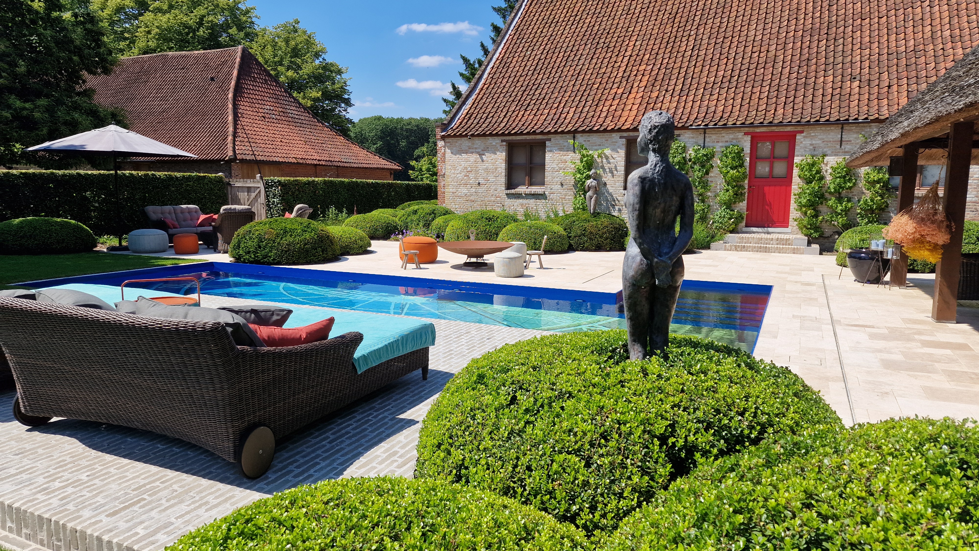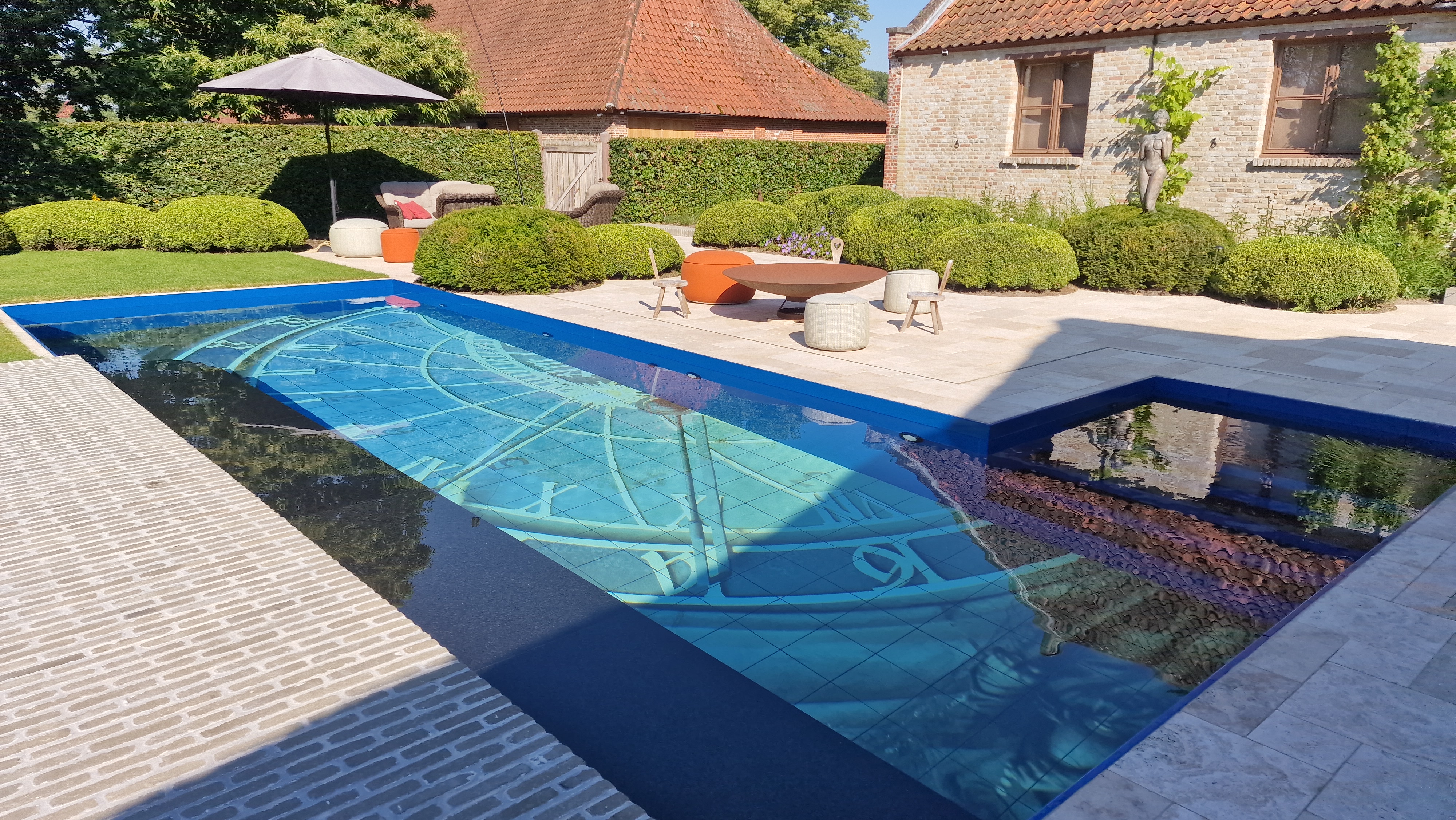 De Travertin tegels werden in dit project gecombineerd met kleiklinkers. Dit geeft het project naast een speels karakter, ook een extra landelijke uitstraling.