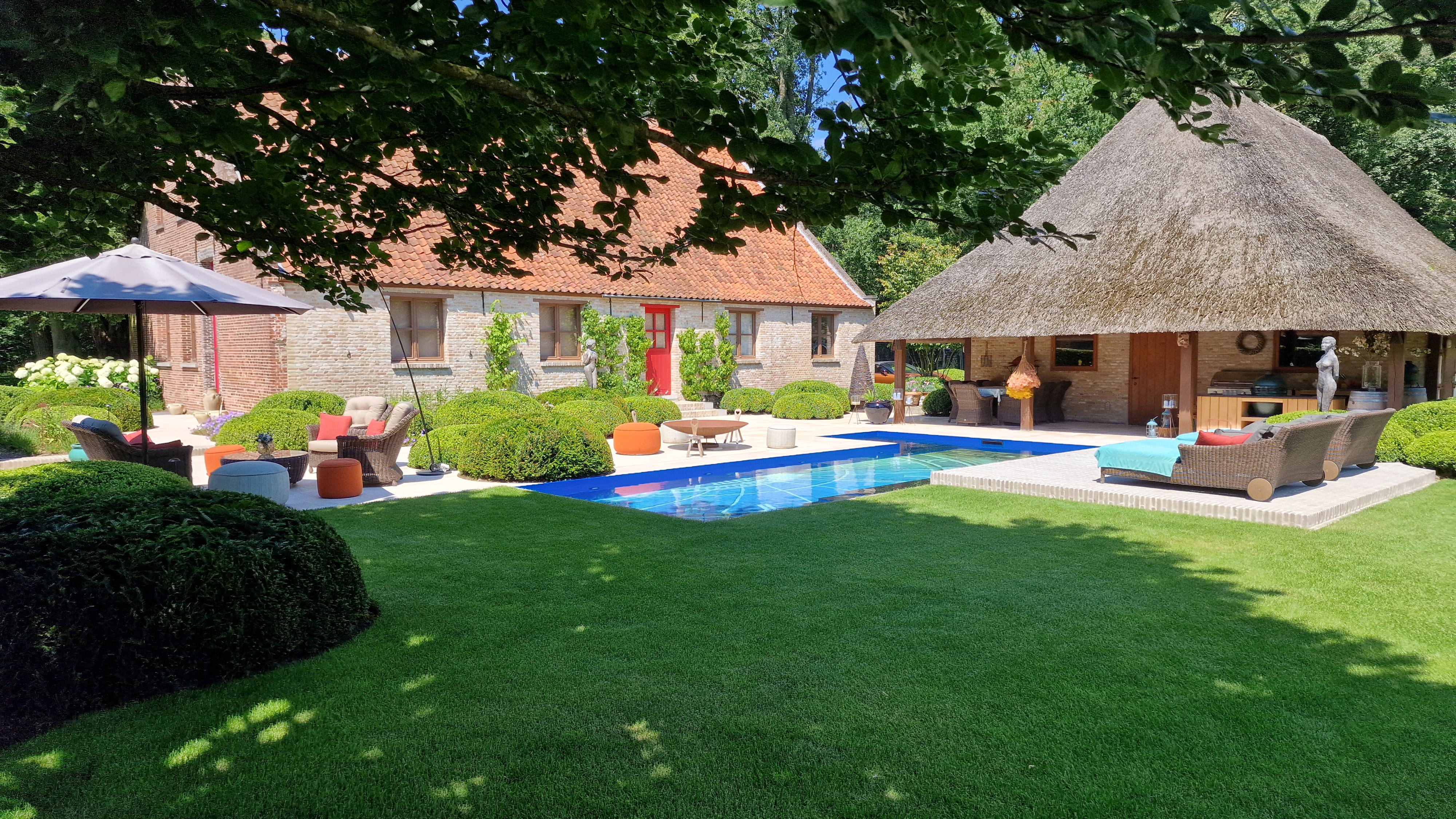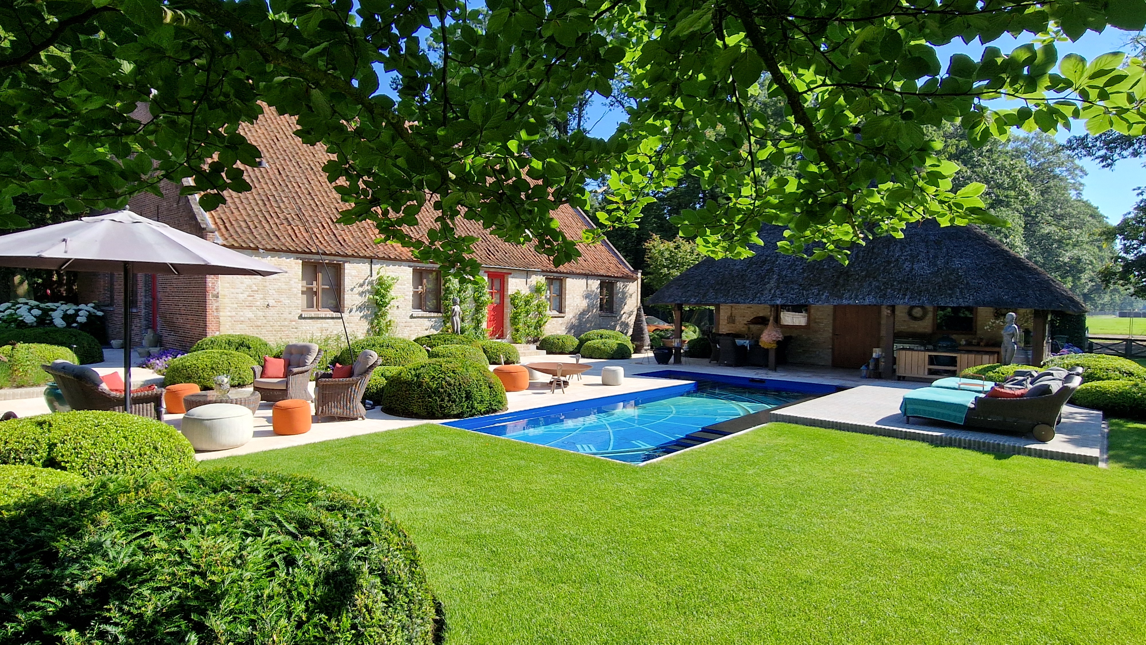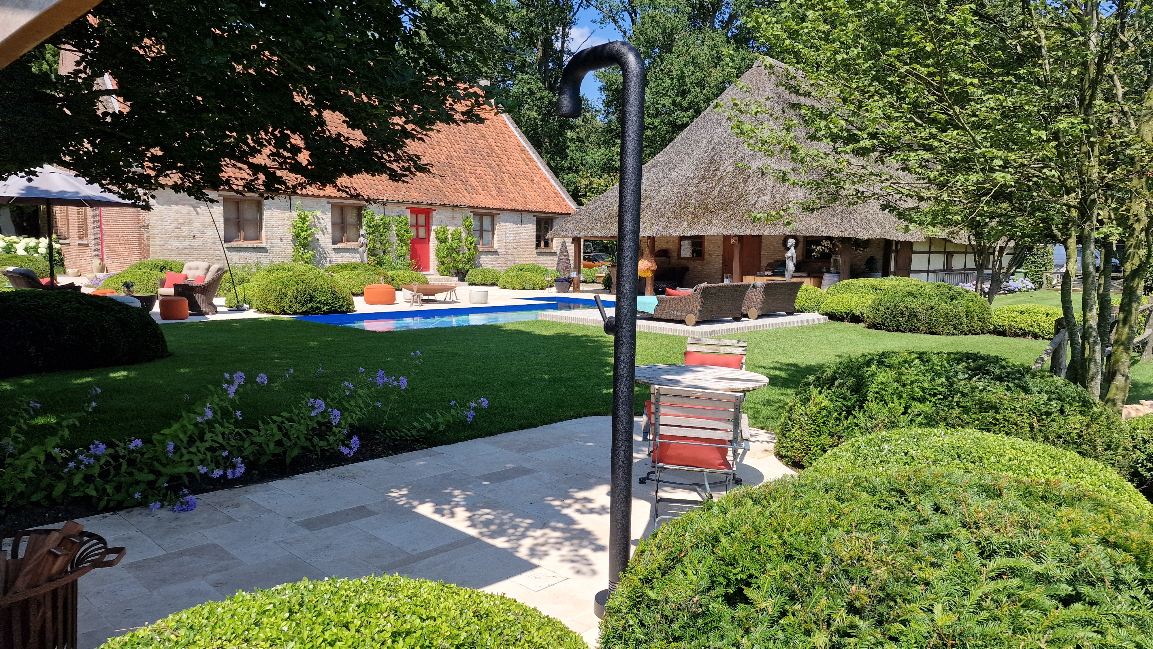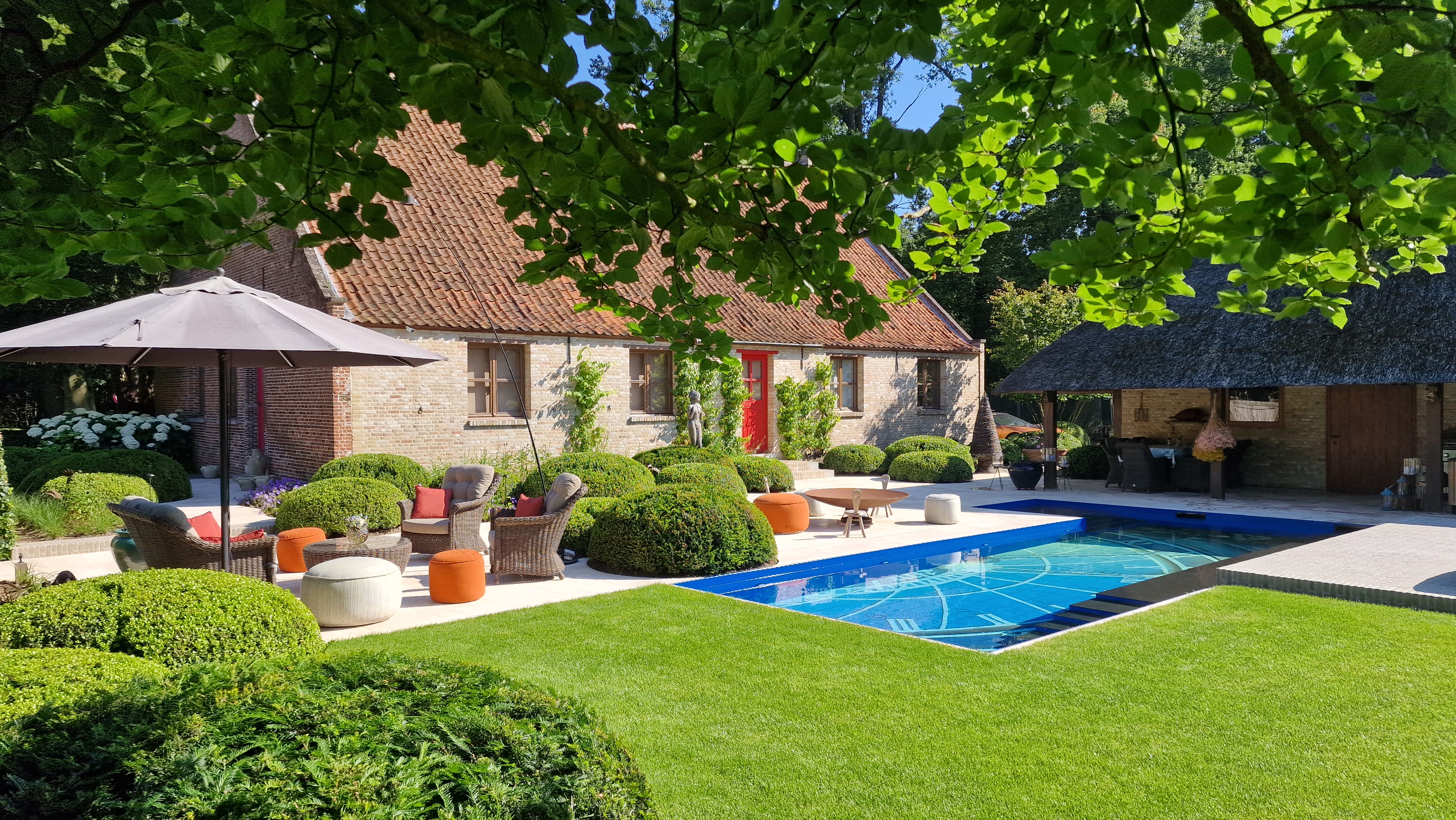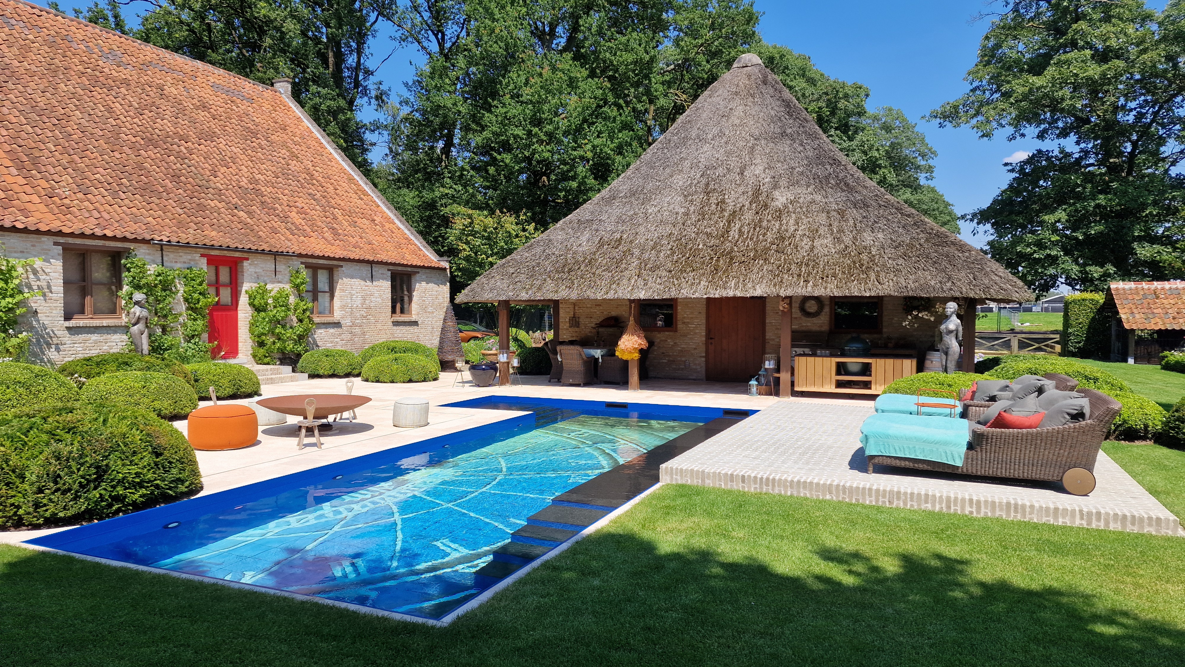 De Travertin tegels werden in dit project gecombineerd met kleiklinkers. Dit geeft het project naast een speels karakter, ook een extra landelijke uitstraling.