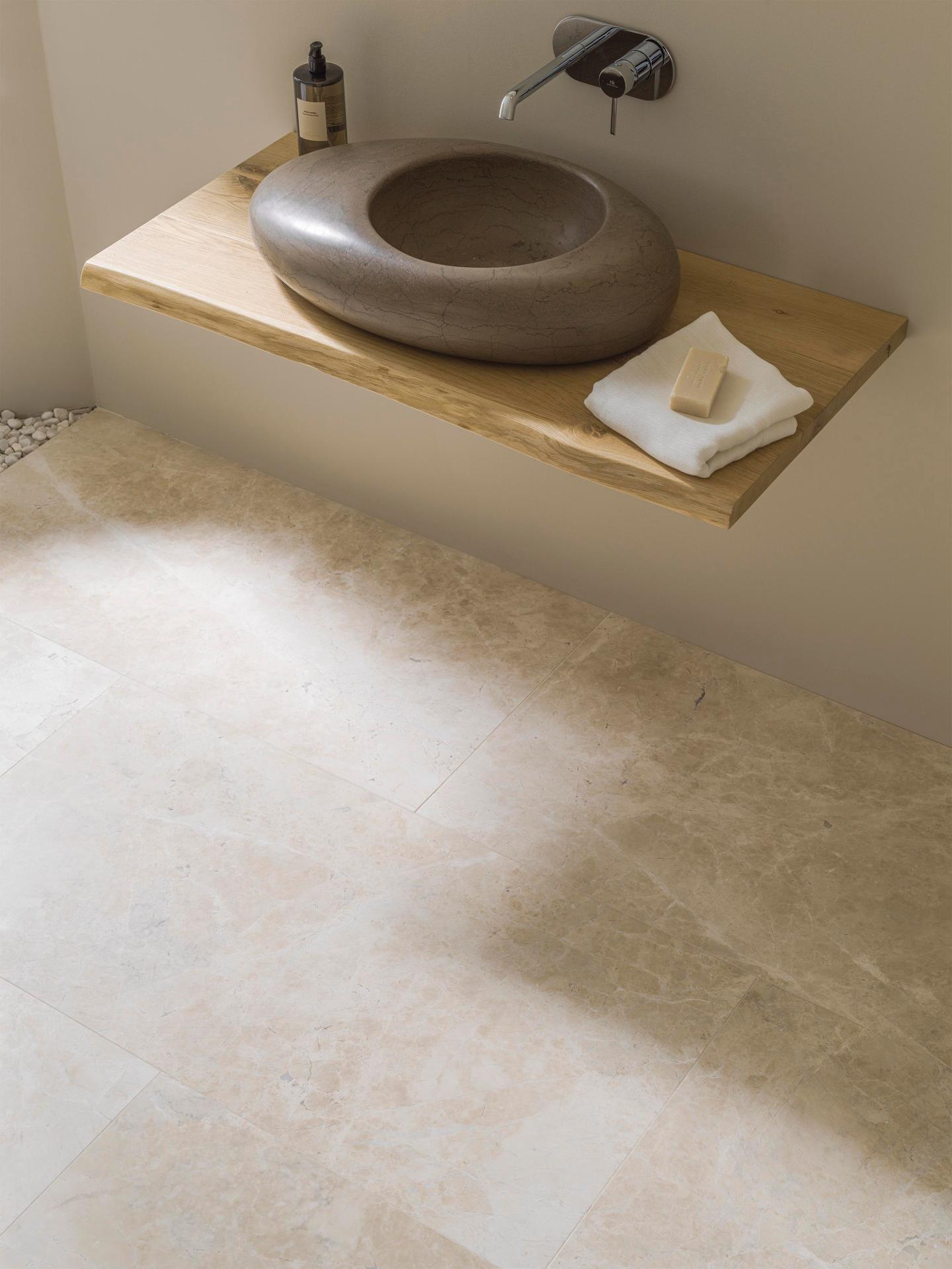 De Lotus Imperiale Gezoet is een van onze meest vooraanstaande marmers. Een schitterende Turkse marmer met een beige/créme kleur. De toplaag van de Lotus Imperiale is perfect gezoet en laat daardoor tevens het opmerkelijke schouwspel van aders perfect aan de oppervlakte komen. De aders in de Lotus Imperiale zijn net als het oppervlak vrij licht van kleur, waardoor de tegel een rustige en sfeervolle uitstraling heeft. Een warme marmer die z’n strepen met recht heeft verdiend.