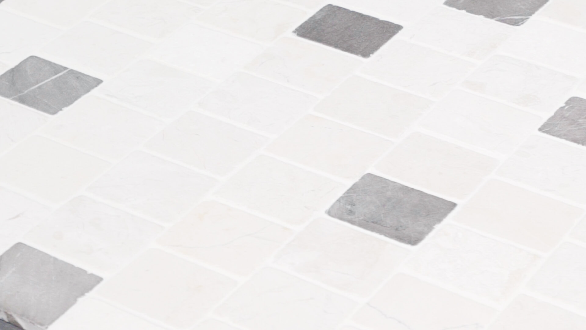 Een speels banenverband van crème marmer met grijze strooitegels.