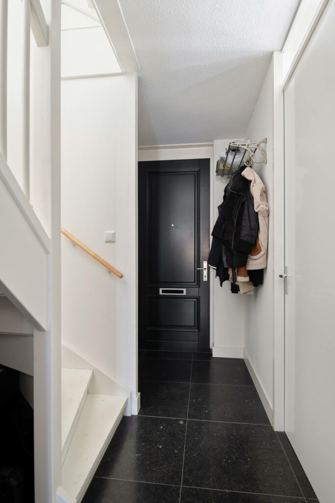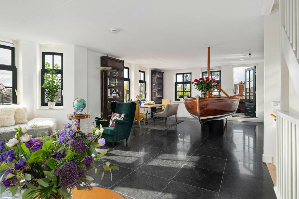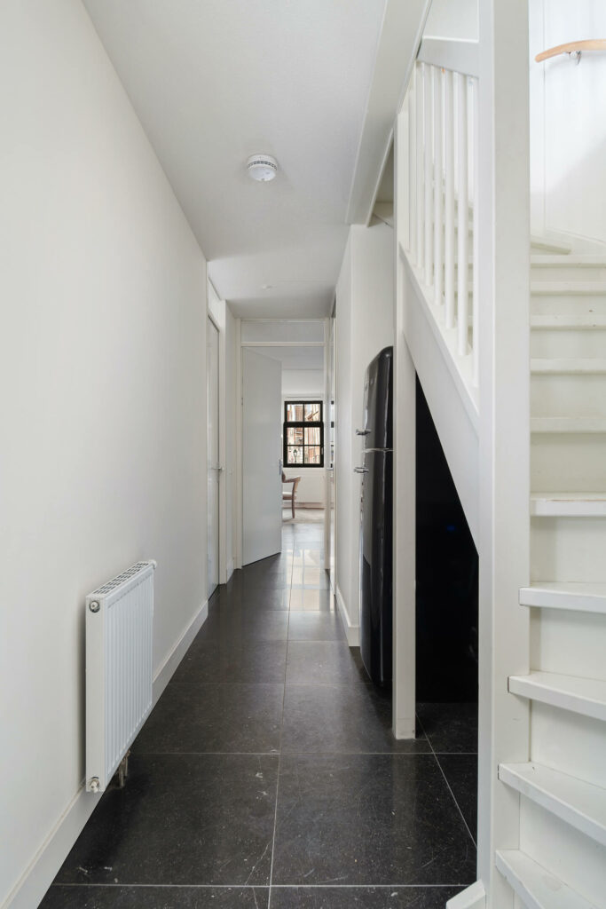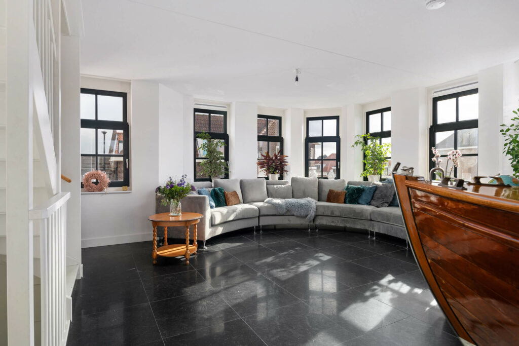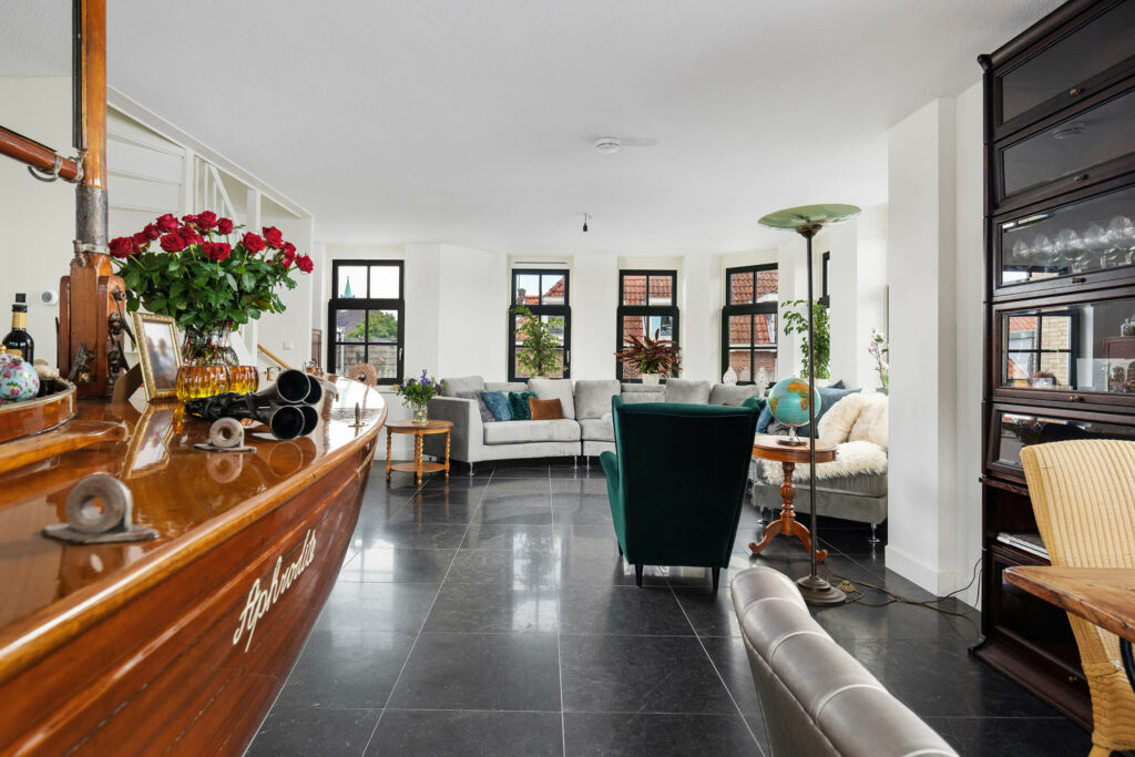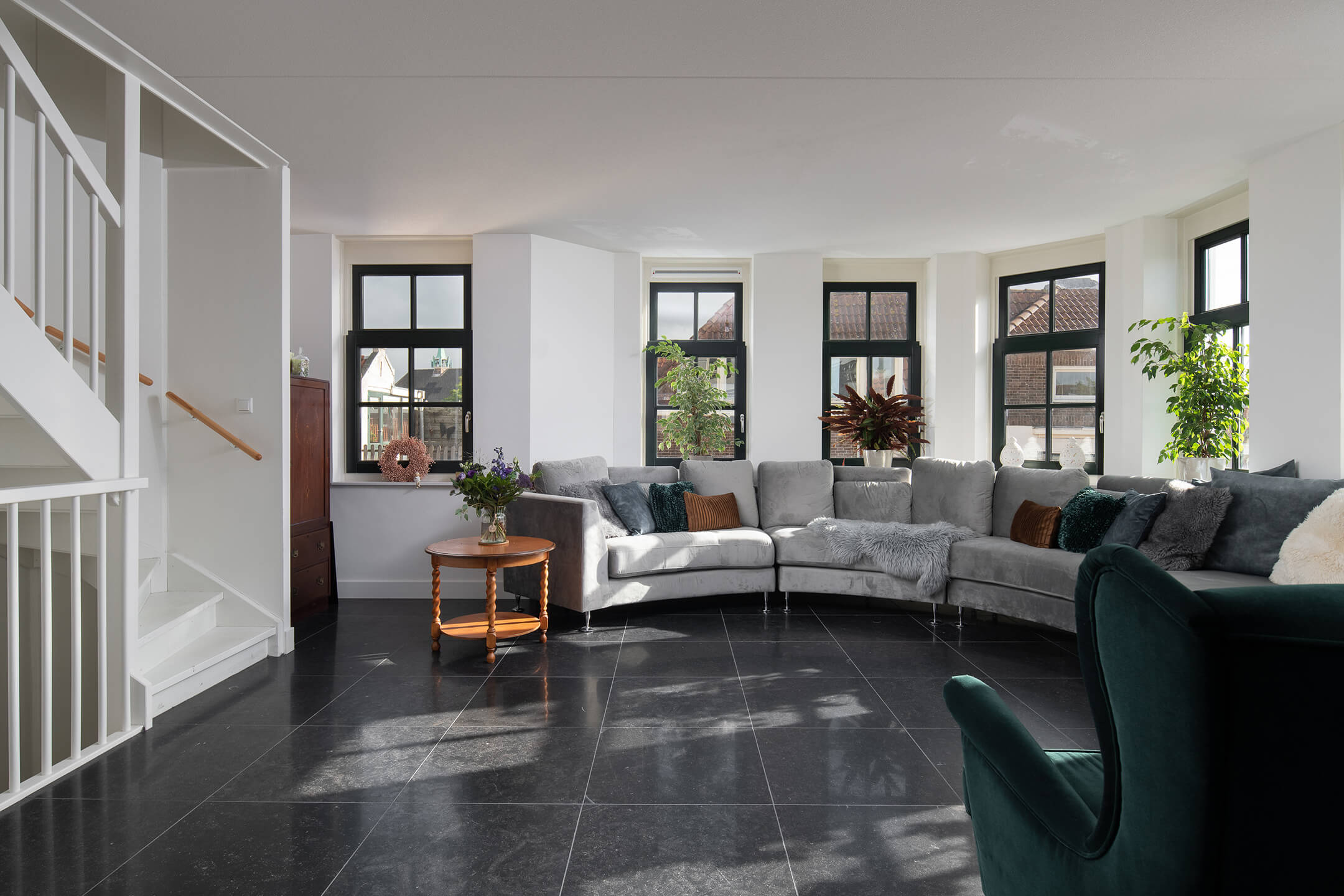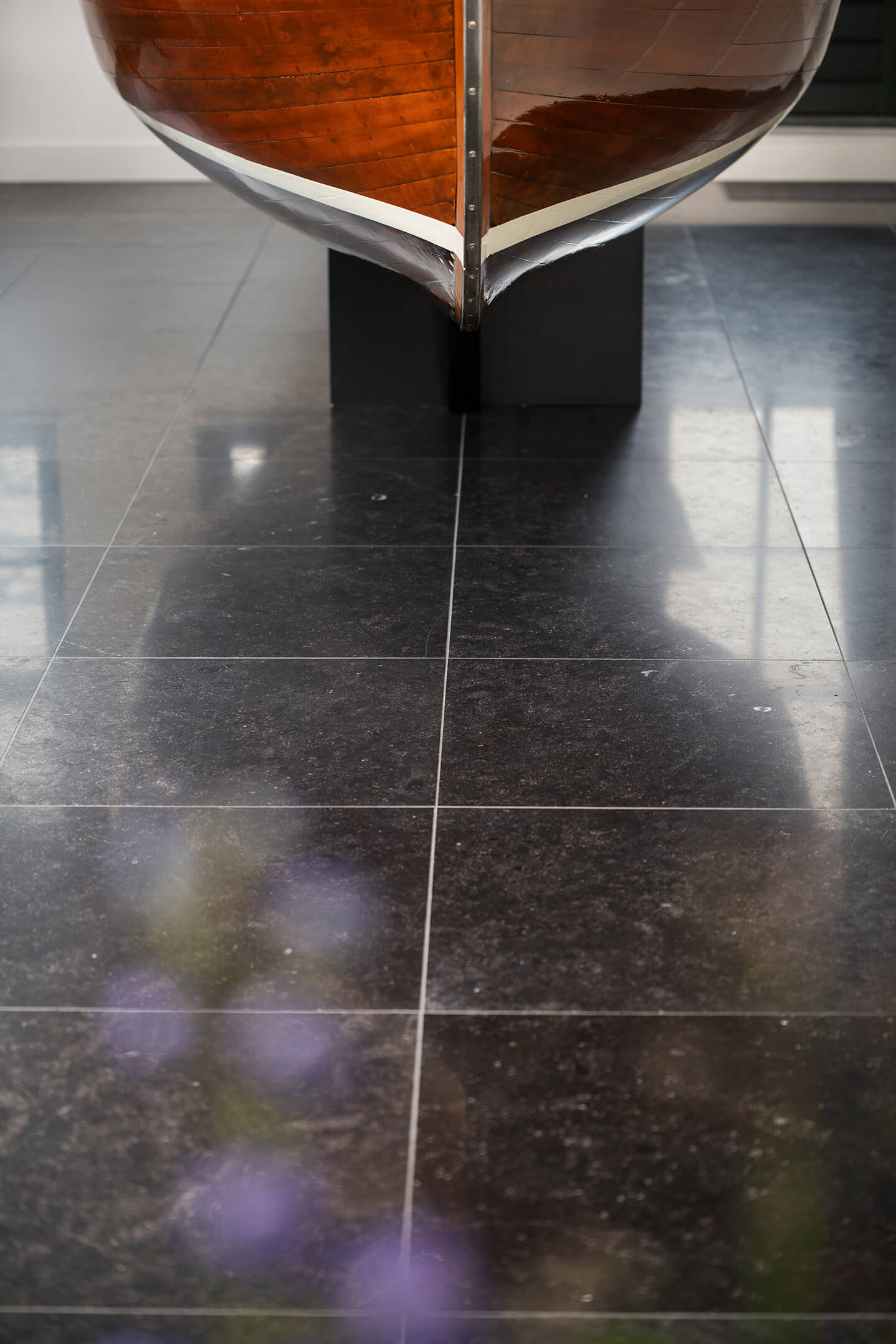 Zowel op de benedenverdieping als de gehele bovenverdieping is de Belgisch Hardsteen in het formaat 60×60 cm geplaatst door ons Tegelzettersgilde. Waar tijdens de verwerking al inspirerende verhalen verteld werden over de schippersfamilie waar mevrouw uit kwam. Zo hebben ze zelf een boot gekocht, opgeknapt en deze vervolgens omgebouwd tot een functioneel keukenblok.