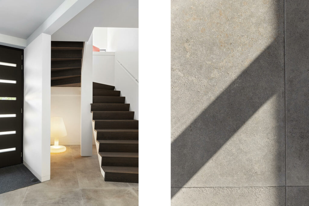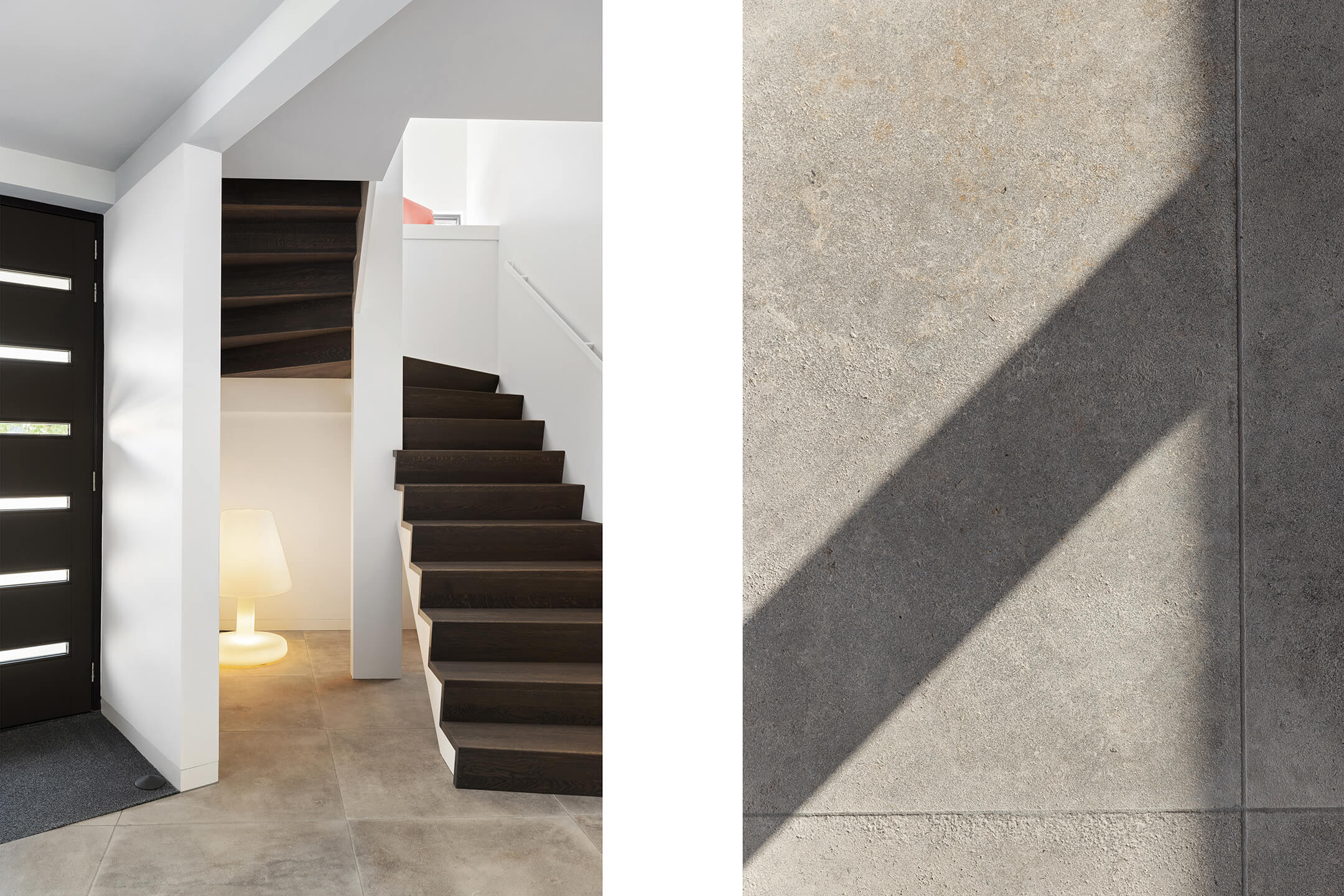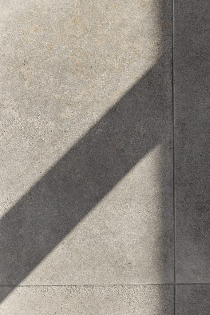 Gezien de grote oppervlaktes is er gekozen voor het formaat 80×80 cm. Deze maat komt perfect tot zijn recht in de ruimtes en brengt een rustige verdeling in de kleurnuances van de natuursteen.