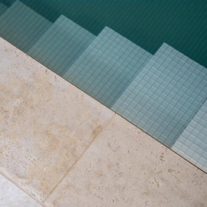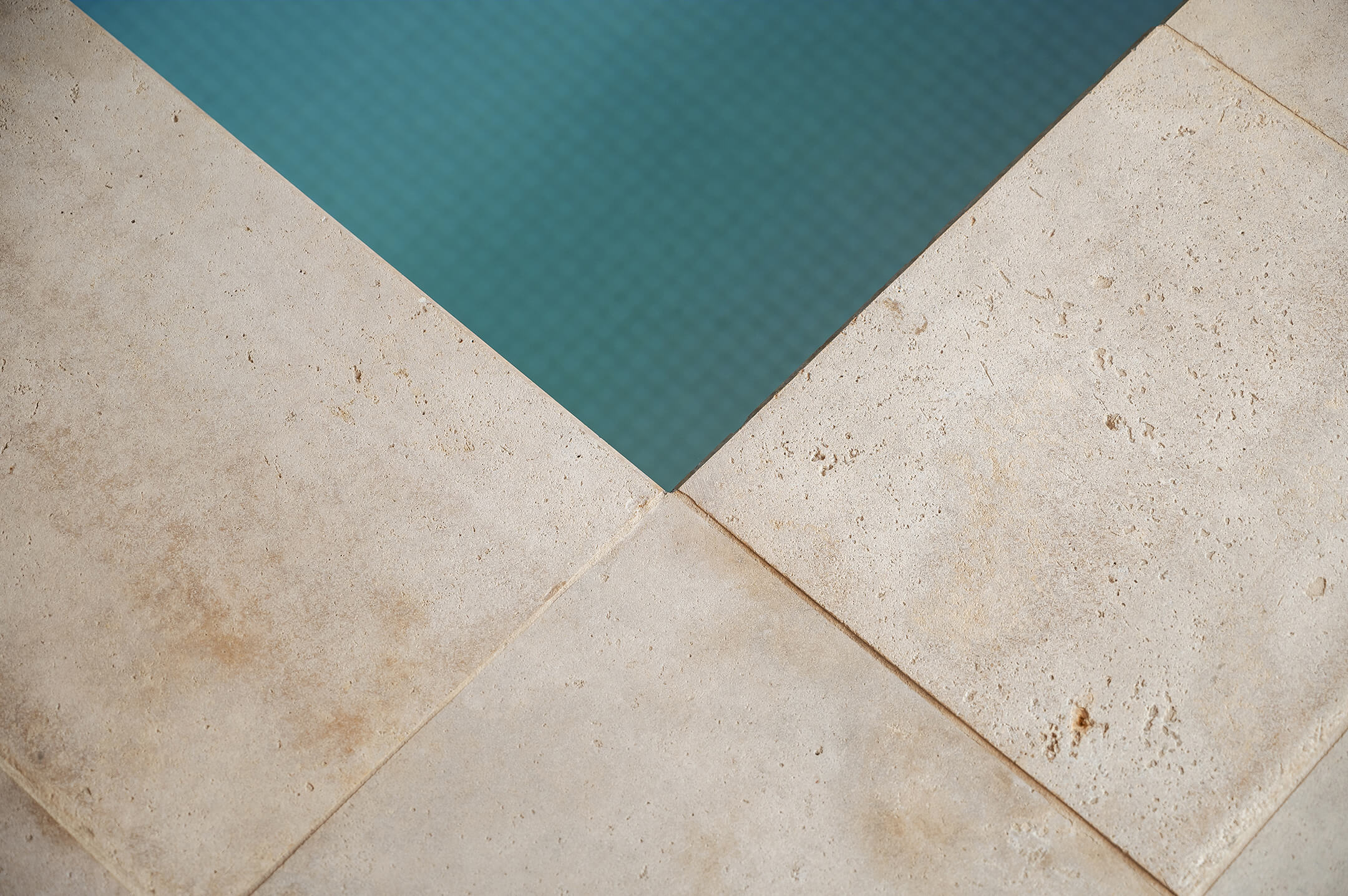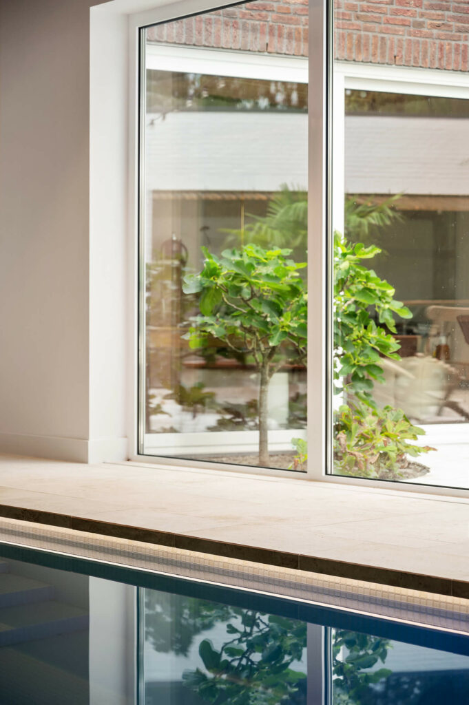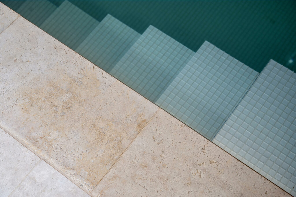 Uiteindelijk hebben we de perfecte natuursteen gevonden en gekozen voor de Travertin Noce in “Arenado” afwerking. Dit materiaal heeft een prachtige warme kleur, mat oppervlak en is tevens perfect te bewerken. De tegels hebben een maat van 90x60x2 cm en zijn verwerkt in een banenverband. De zwembadranden hebben we uit hetzelfde materiaal laten maken. Zo vormt alles een rustig en stijlvol geheel.