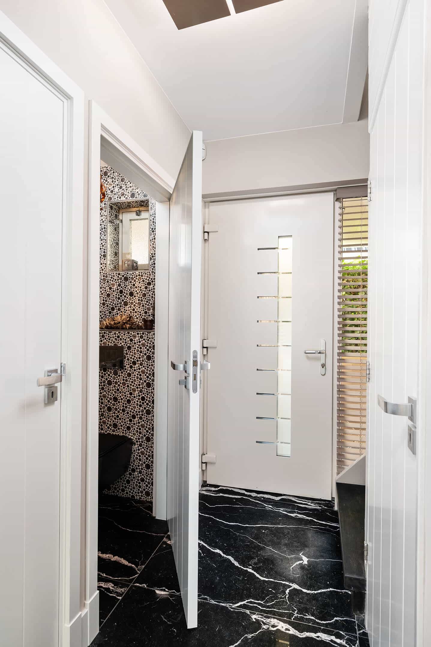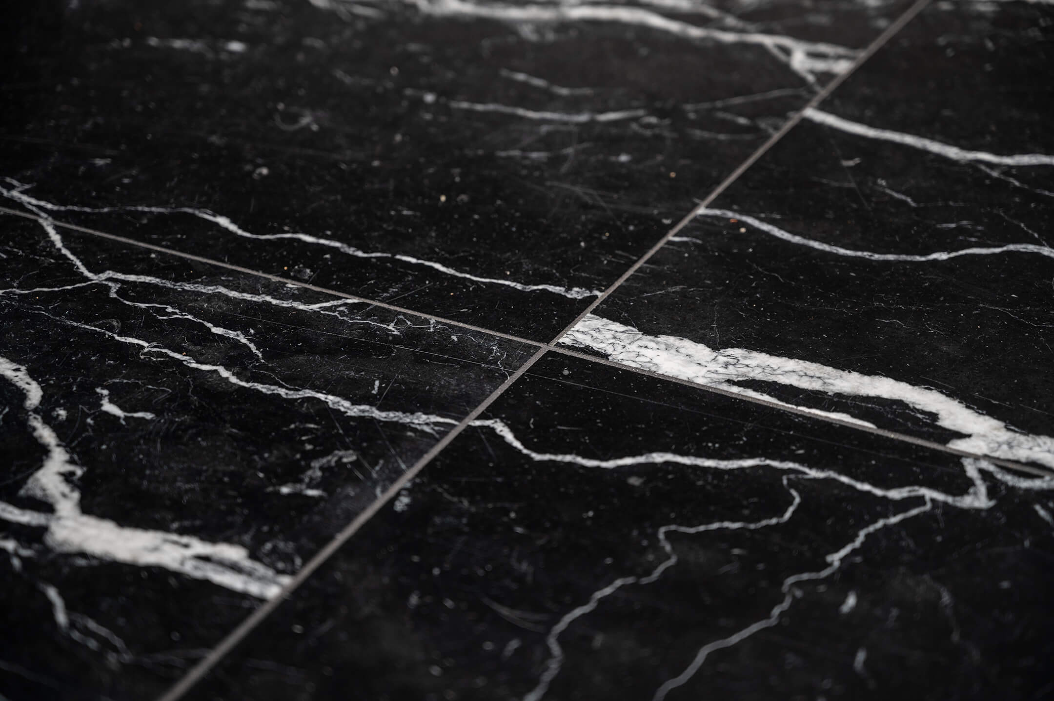 De kleur van de tegels is diep zwart met heldere witte aders hier doorheen verwerkt, hier en daar vormt er vanuit de natuur een witte bewolking in het materiaal wat het oppervlak nóg meer laat leven. Een ander mooi element is de afwerking van dit materiaal, door de hoog gepolijste afwerking geeft het direct een chique, moderne sfeer aan het huis.