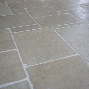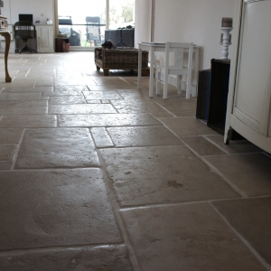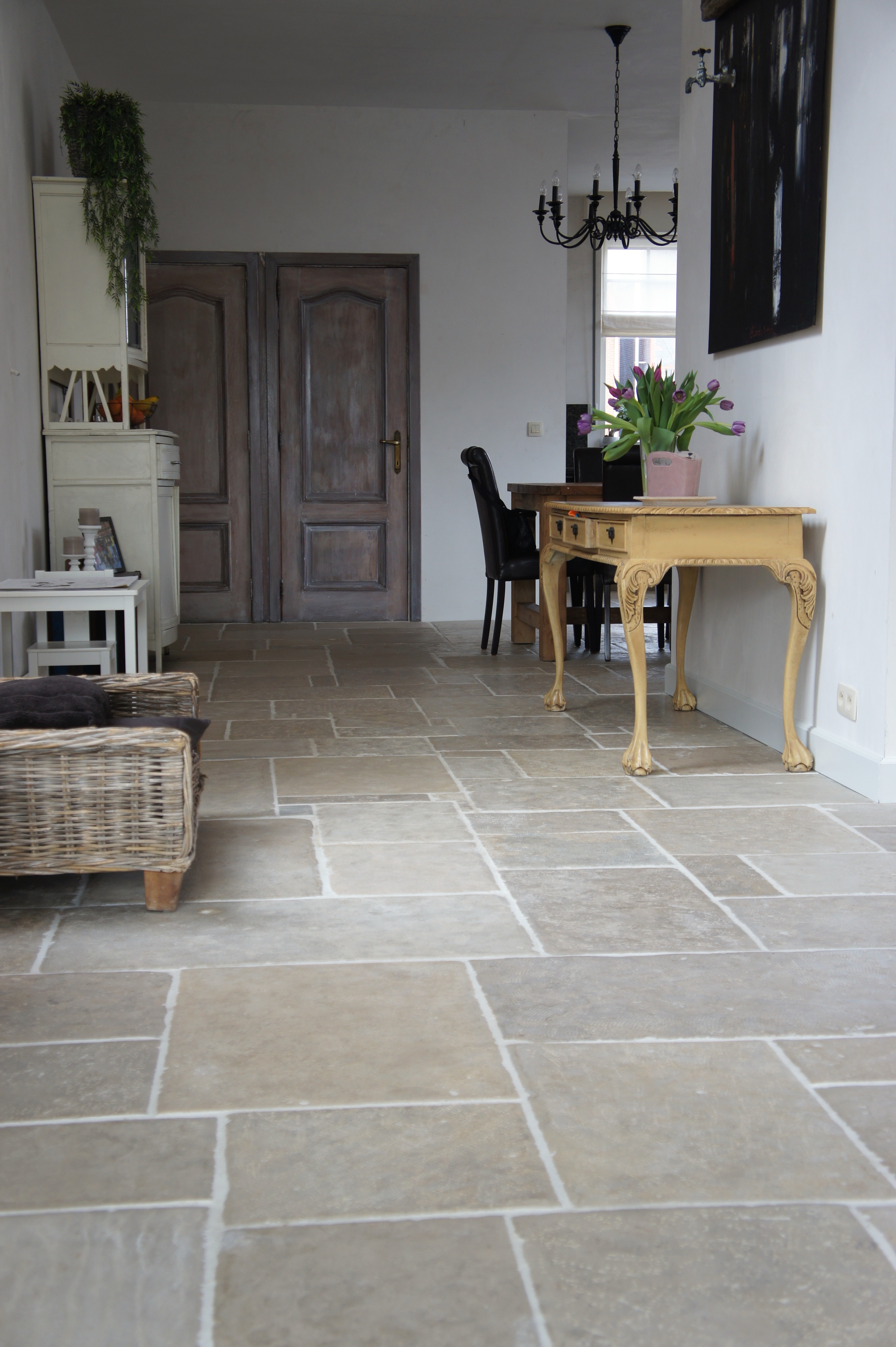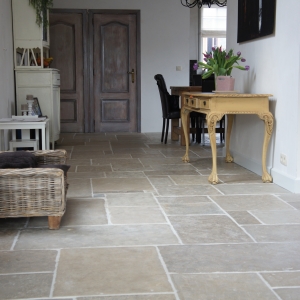 Nikkie de Bie was op zoek naar Bourgondische Dallen. In onze showroom vond ze de Pietra Etrusca Beige met de “Anticato” afwerking. We hebben er daarna voor gekozen om de Pietra Etrusca Beige en Grigio te mengen. Dat heeft de vloer nog meer sfeer gegeven dan alleen de Beige kleur had gedaan. De tegels werden door Cor van den Heuvel (Van den Heuvel & Zn. / TegelzettersGilde) in een wild verband verwerkt.