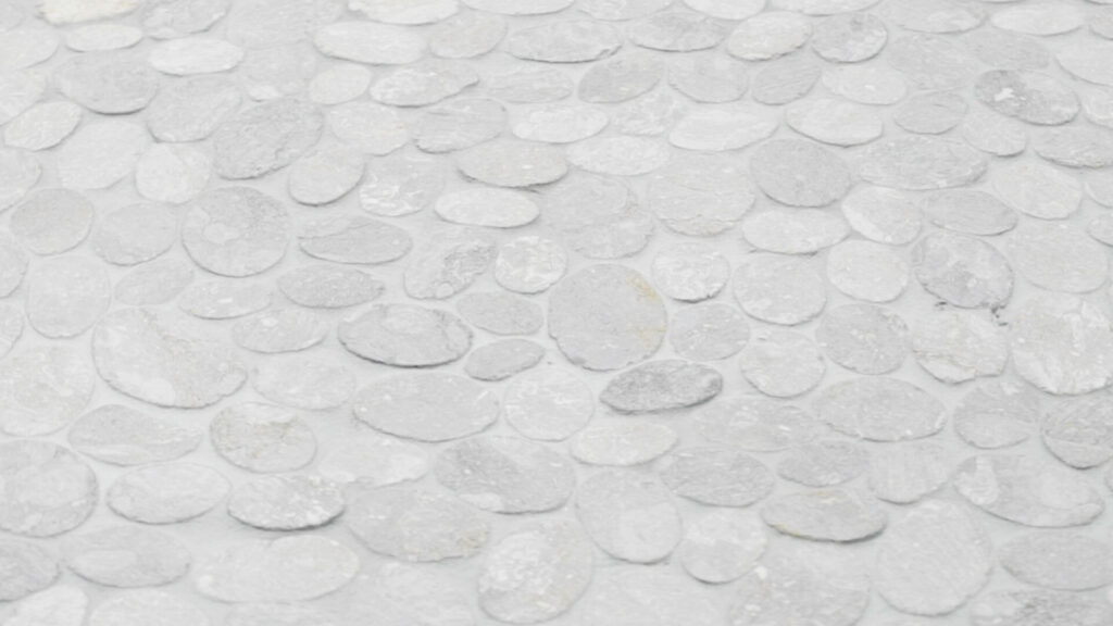 Een marmer mozaïek van ovale vlakke marmersteentjes in een smaakvolle lichtgrijze kleurenmix.