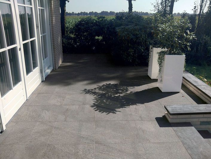 Een prachtige keramische lichtgrijze leisteen look voor op het terras.