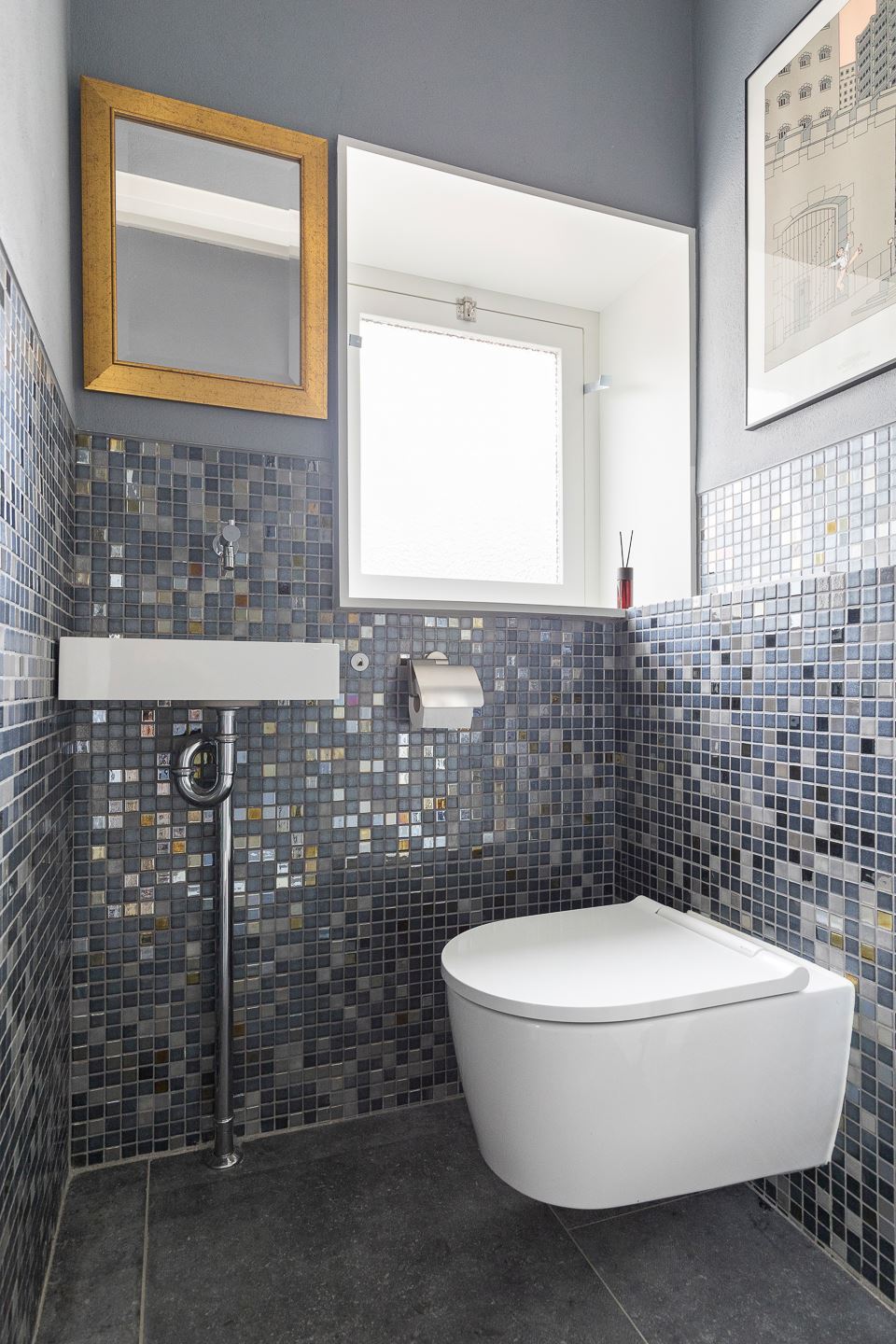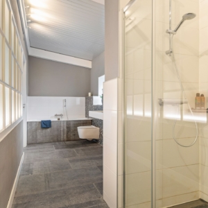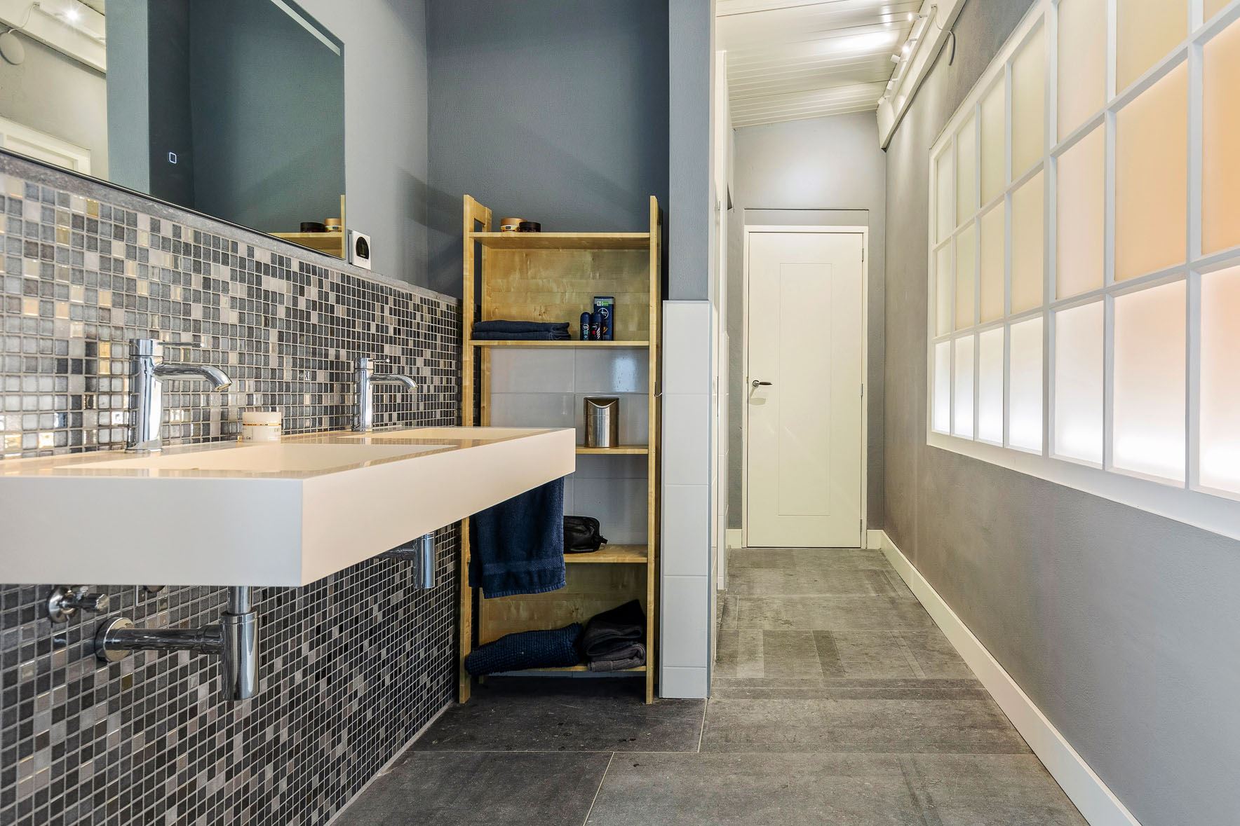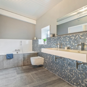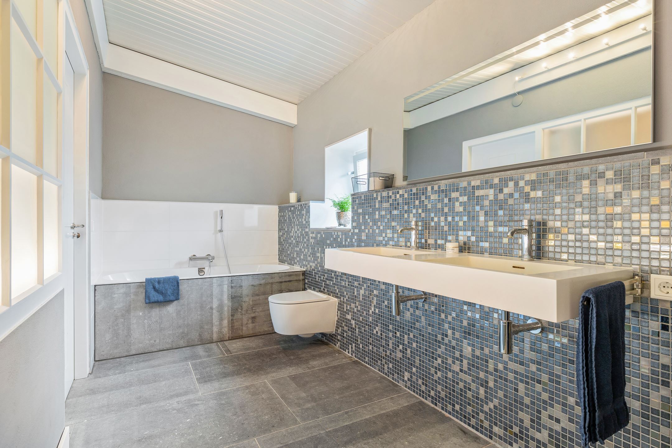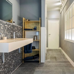 Omdat de vloer doorloopt in de natte ruimtes hebben we ook gezocht naar een bijpassende wandtegel. Echter bleek dit niet het juiste gevoel te geven, en zijn we uiteindelijk gegaan voor een prachtige Gin Fizz Glasmozaïek. Deze Glasmozaïek is van het merk Ezarri en is afkomstig uit de Cocktail Collection. en bevat de perfecte kleuren om deze te combineren met het Belgisch Hardsteen.