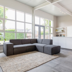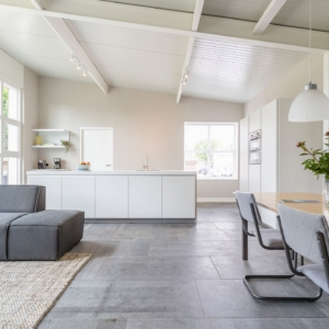 Toen deze familie bij ons in Breda terecht kwam met dit project hebben we uitgebreid besproken wat de wensen waren. Het pand moest een moderne en eigentijdse uitstraling krijgen, maar met respect voor het voormalige schoolgebouw. Met deze informatie zijn we op zoek gegaan, en zijn we uiteindelijk uitgekomen bij onze Belgisch Hardsteen Raamzaag Gezaagd. Een prachtige moderne/ industriële vloer die zich kenmerkt door zijn prachtige grijs/ blauwe kleur, fossielen en stoere zaaglijnen. Dit materiaal sloot precies aan op de gewenste stijl van het interieur.