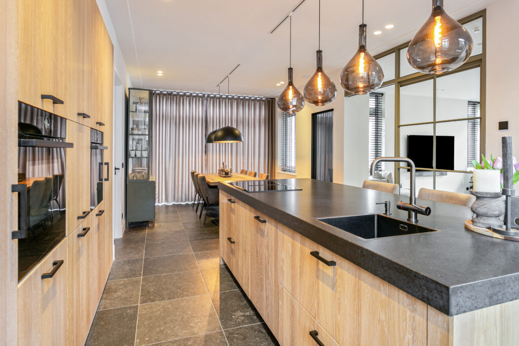 De keuze voor een afgeleide van Belgisch Hardsteen werd bepaald door de verschillende moderne elementen welke terug zouden gaan komen in de keuken en entree. Er zou veel met hout gewerkt gaan worden en de metalen handgrepen, trapleuningen en poten werden matzwart gepoedercoat. Één van de vele toepassingen welke we in deze tijd vaak terugzien in deze moderne inrichtingen. Waar hout en de kleur van Belgisch Hardsteen altijd zorgt voor een perfecte combinatie, is dit project het bewijs dat de kleine, matzwarte elementen ervoor zorgen dat je van een 10, een 11 kunt maken.