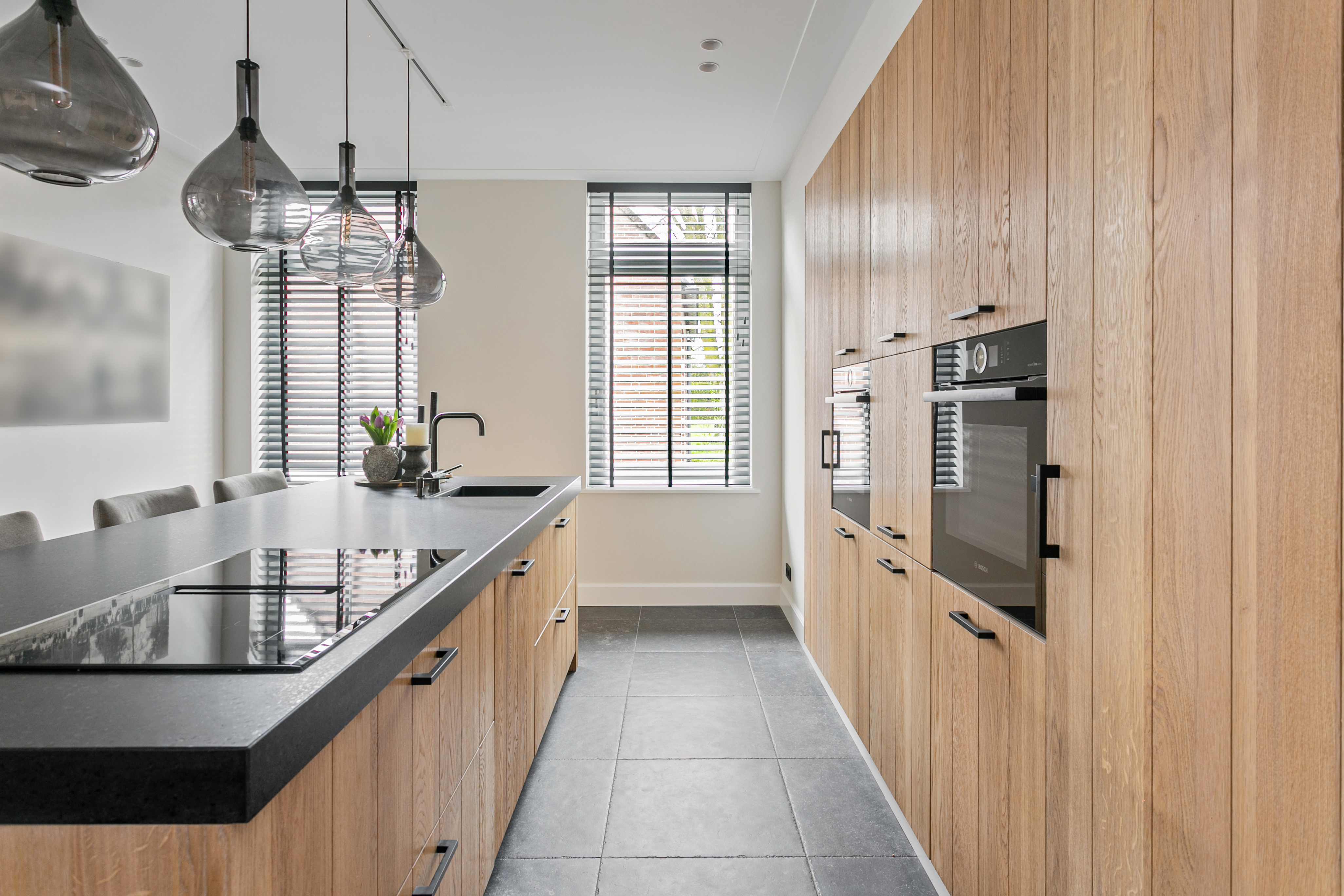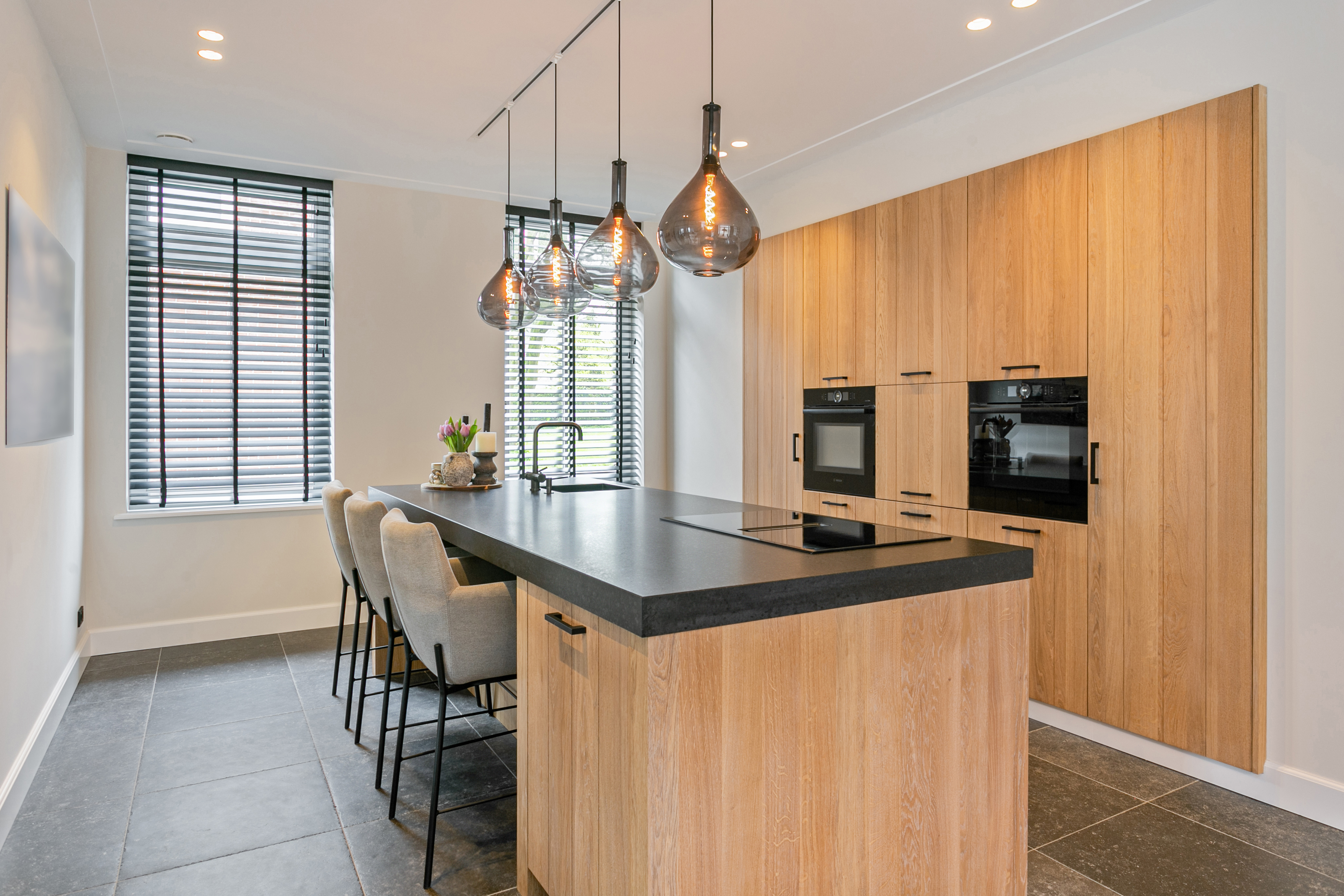 Er is gewerkt met een donker composiet werkblad, welke mooi afsteekt met de houten bekledingen van de keuken. Waar bijvoorbeeld ook de keuze is gemaakt voor een lichte grijstint in de krukken, waarvan de kleur dan weer overeenkomt met de grijze fossielen in onze Belgisch Hardsteen look.