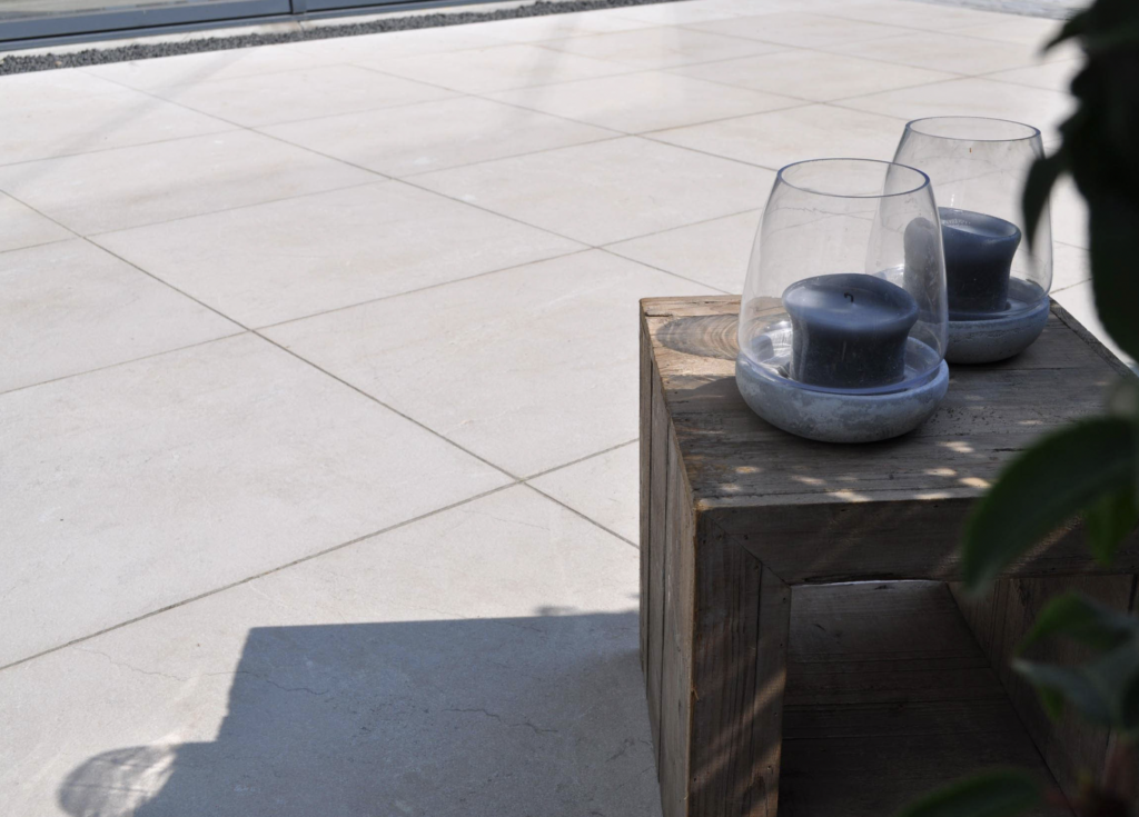 Een zeer chique beige terrastegel met anti-slip afwerking.