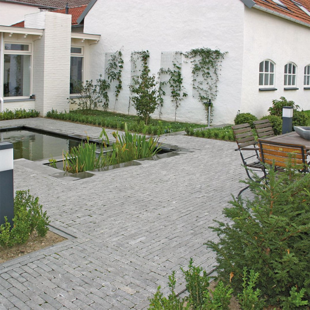 De Spotted Bluestone “Soft Finish” in Waalformaat kan gemakkelijk verwerkt worden op een zandbed. Mocht u zeker willen zijn van maximale stabiliteit, dan kunt u hier eventueel wat cement aan toevoegen en de steentjes verwerken in het zogenaamde gestabiliseerde zand.